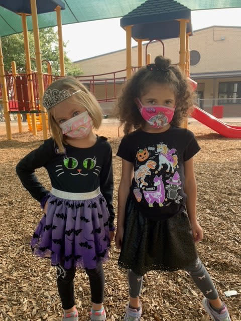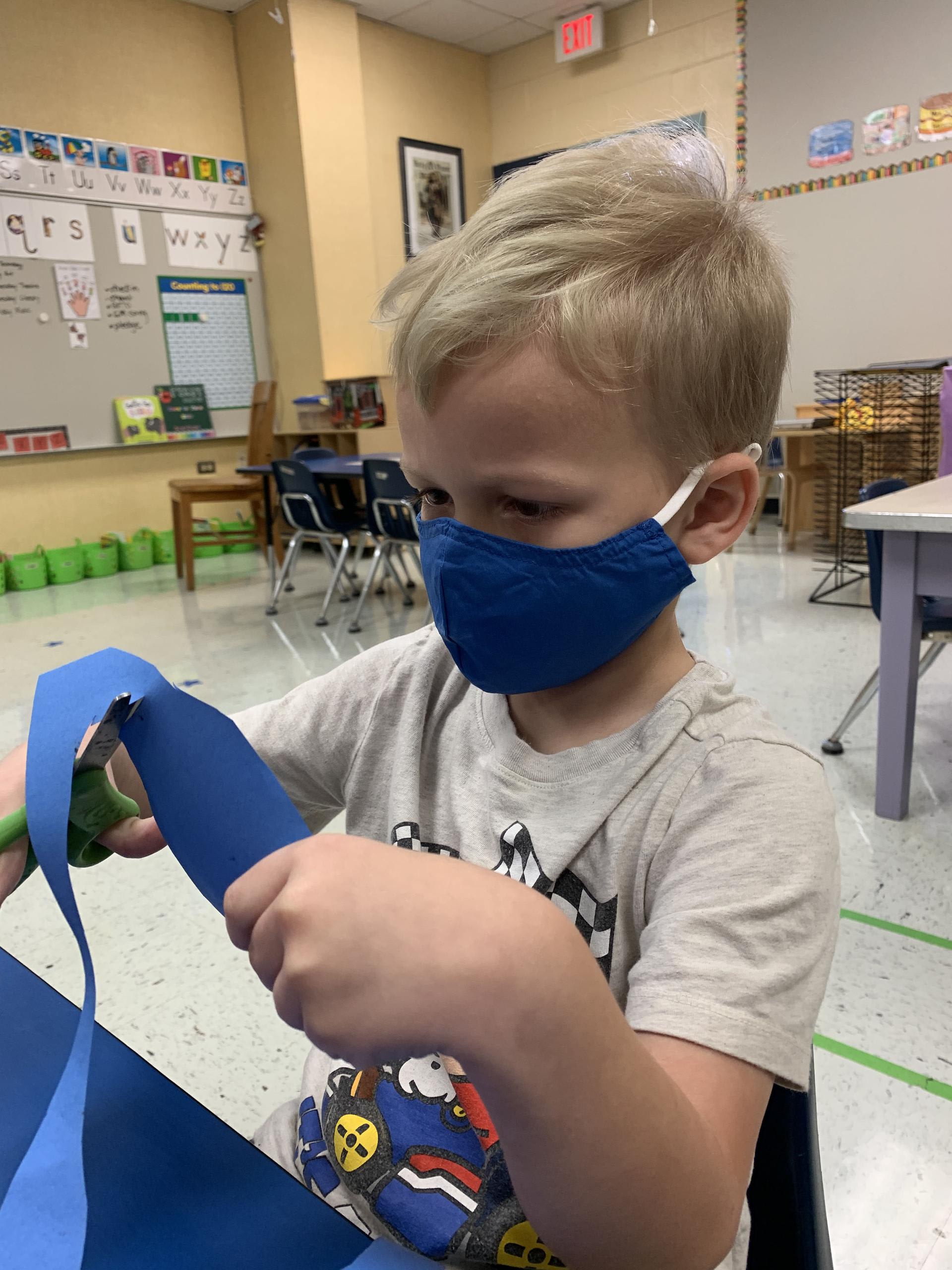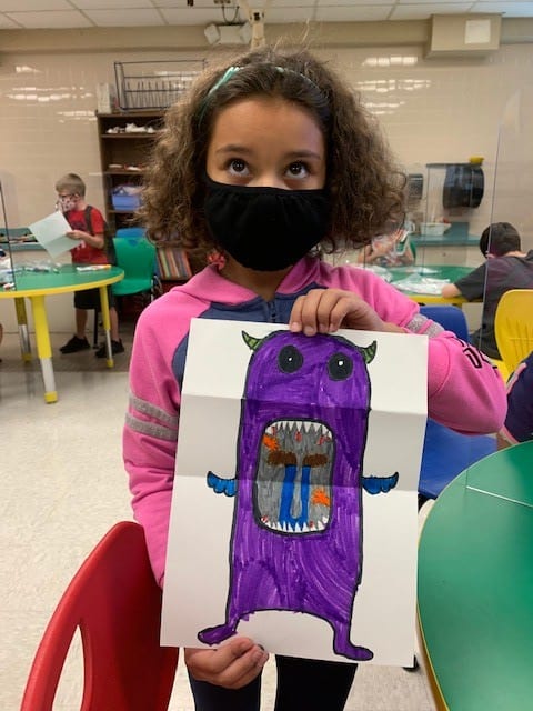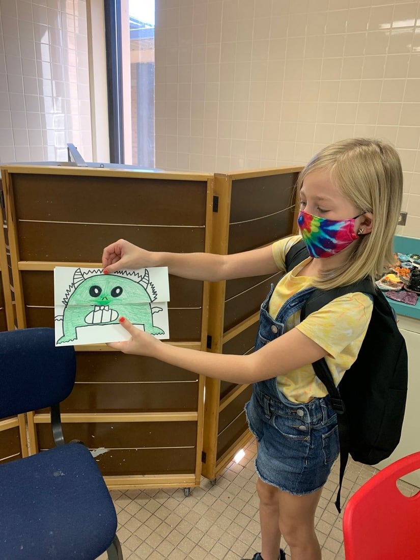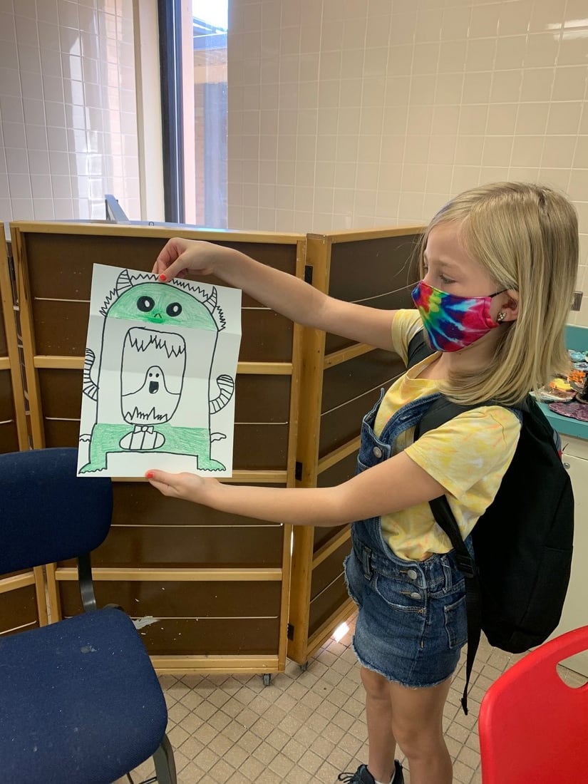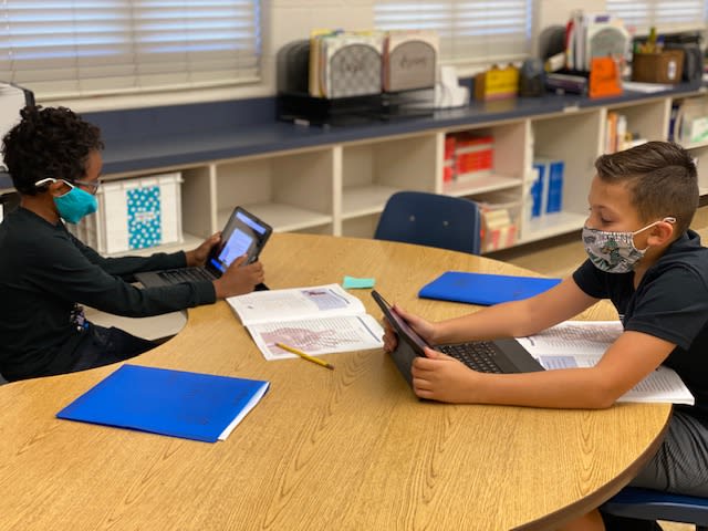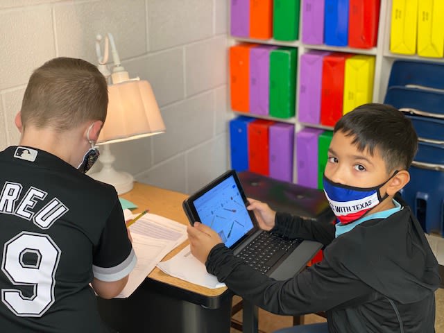 Load the app on your phone: ‘Yearbook Snap’ Elementary Happenings 4th graders practice wearing masks and social distancing during SFA reading.
