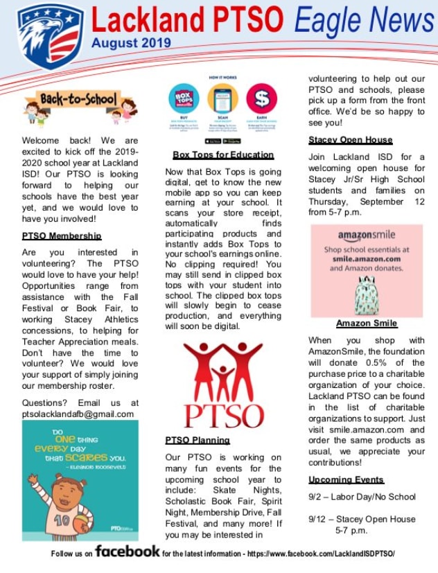 1. Admin Alley 2. Around the District 3. Stacey Happenings 4. Elementary Happenings 5. PTSO Spotlight 6. Good Information 7. Random Shots Upcoming Events: