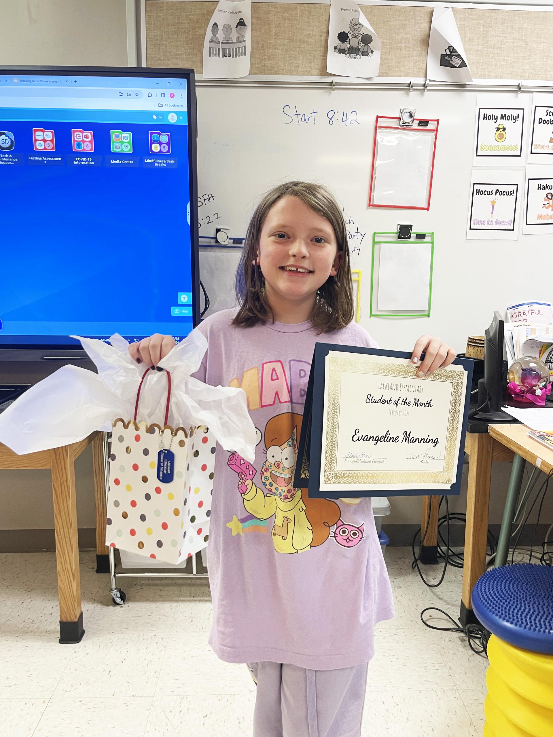 Evangeline Manning: “Evie is that student who is always doing the right thing, but more importantly, she is her classmates' keeper. She is a nurturer and is always paying attention to those around her. If someone is having a bad day, she is there to lift up their spirits. Everyone likes her because she treats everyone kind. She is a good listener when her peers speak and always displays a genuine concern if anyone gets hurt or having a stressful moment. She has shown this consistent behavior all year and that is why I feel she deserves this recognition.” |