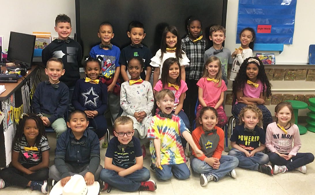 Mrs. Rodriguez's 1st grade class says goodbye to a classmate by all wearing his trademark Bow-tie. Bye Therion! Good Information JBSA Lackland Library Calendar