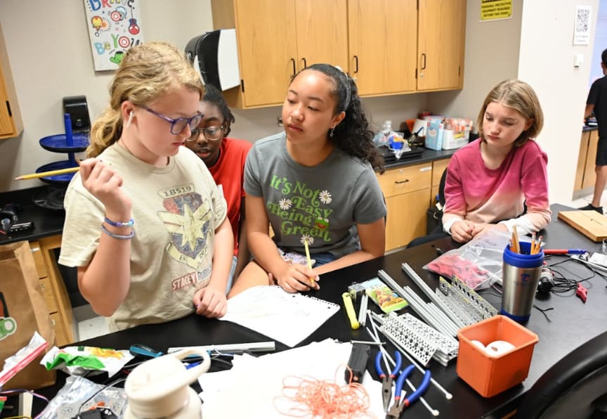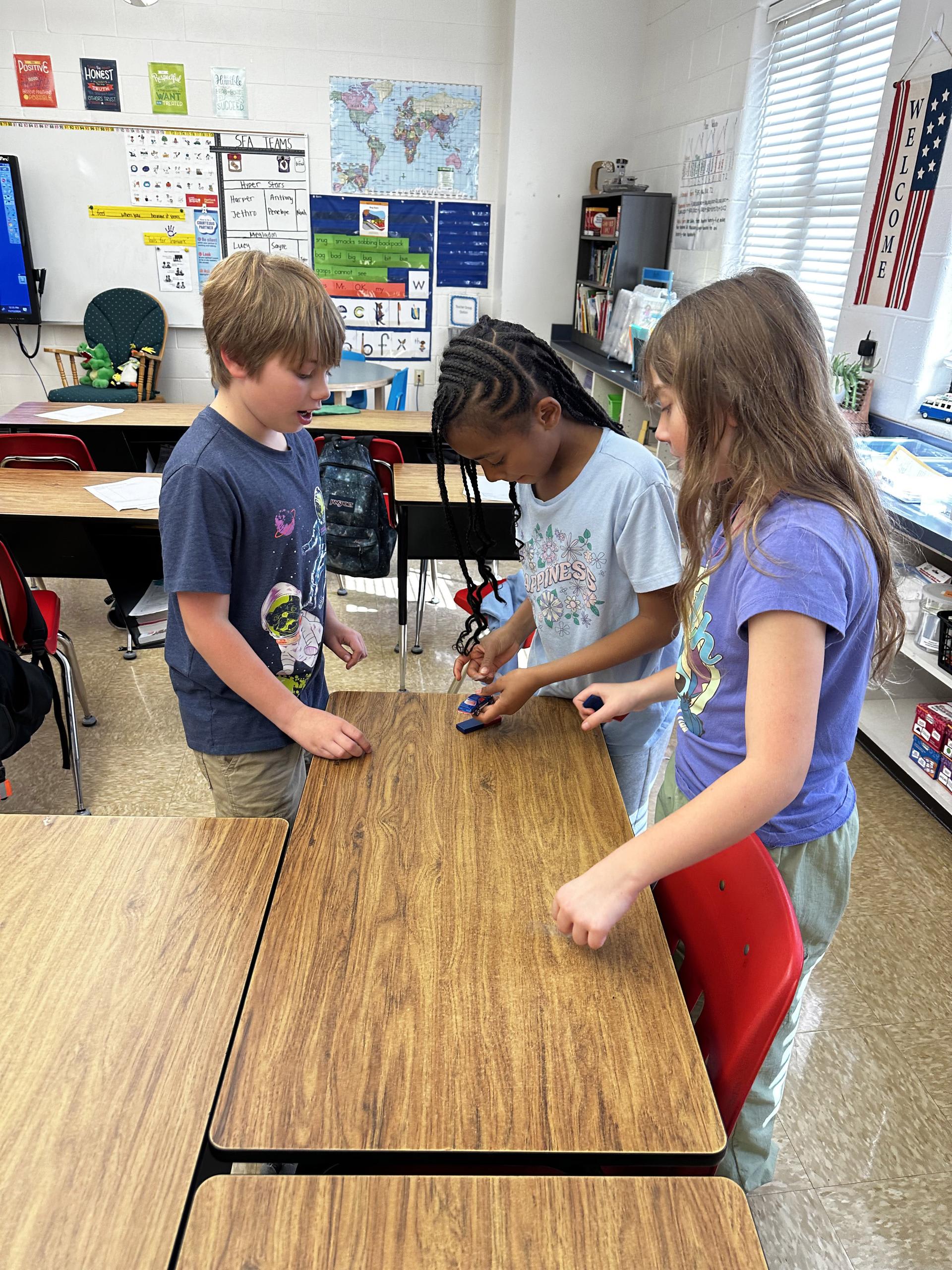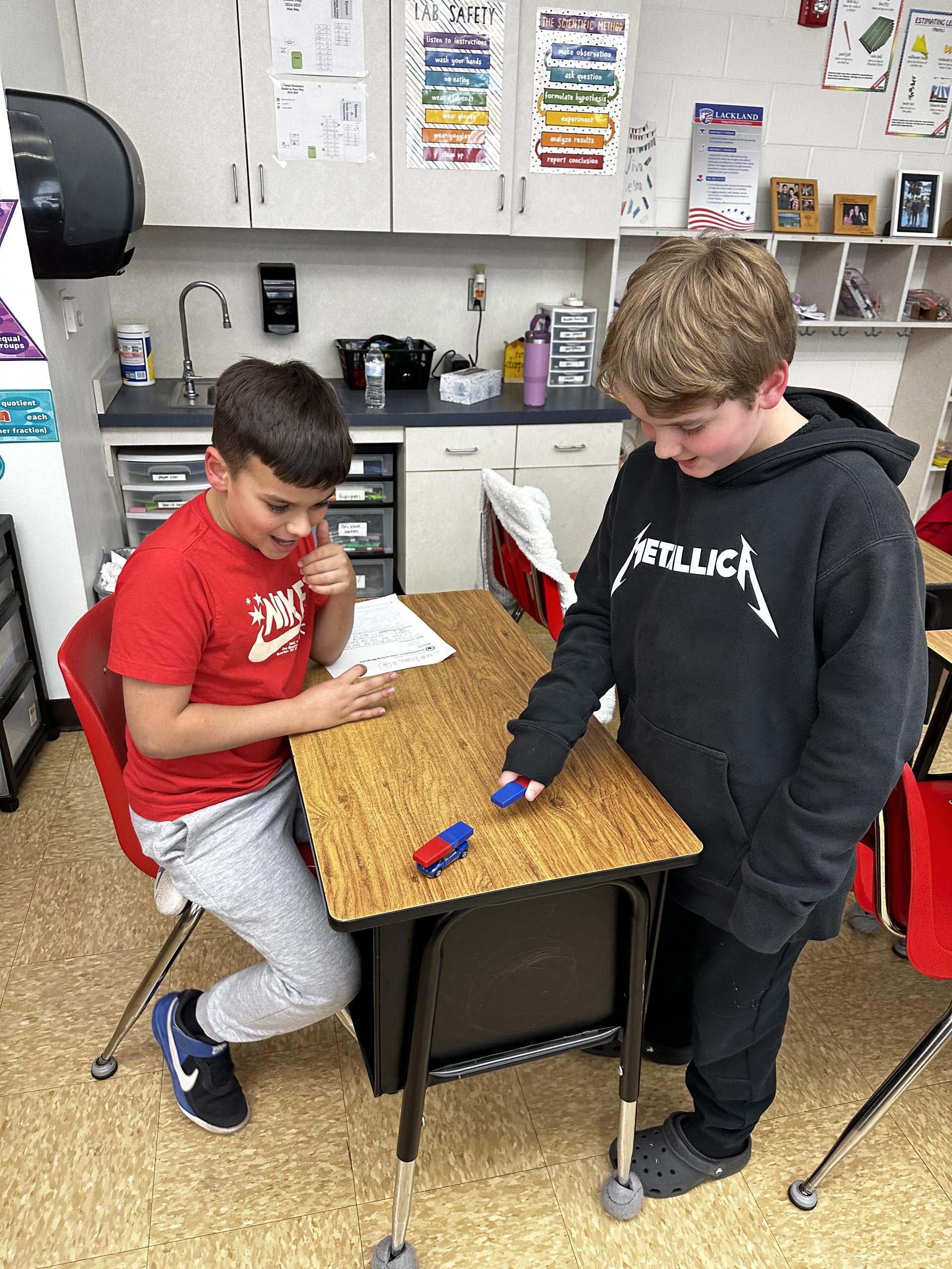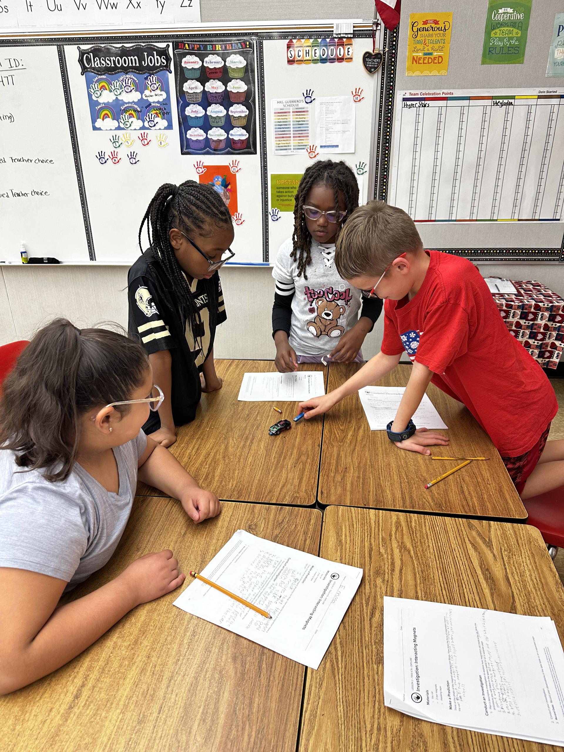 Lab fun with magnets! Students planned an investigation with their teams to explore how magnetism can move a toy car. |