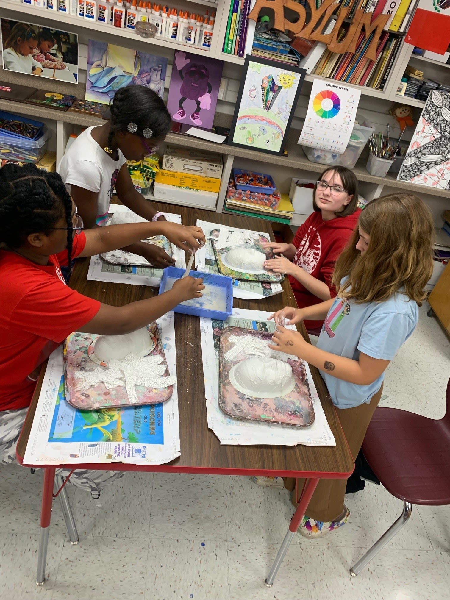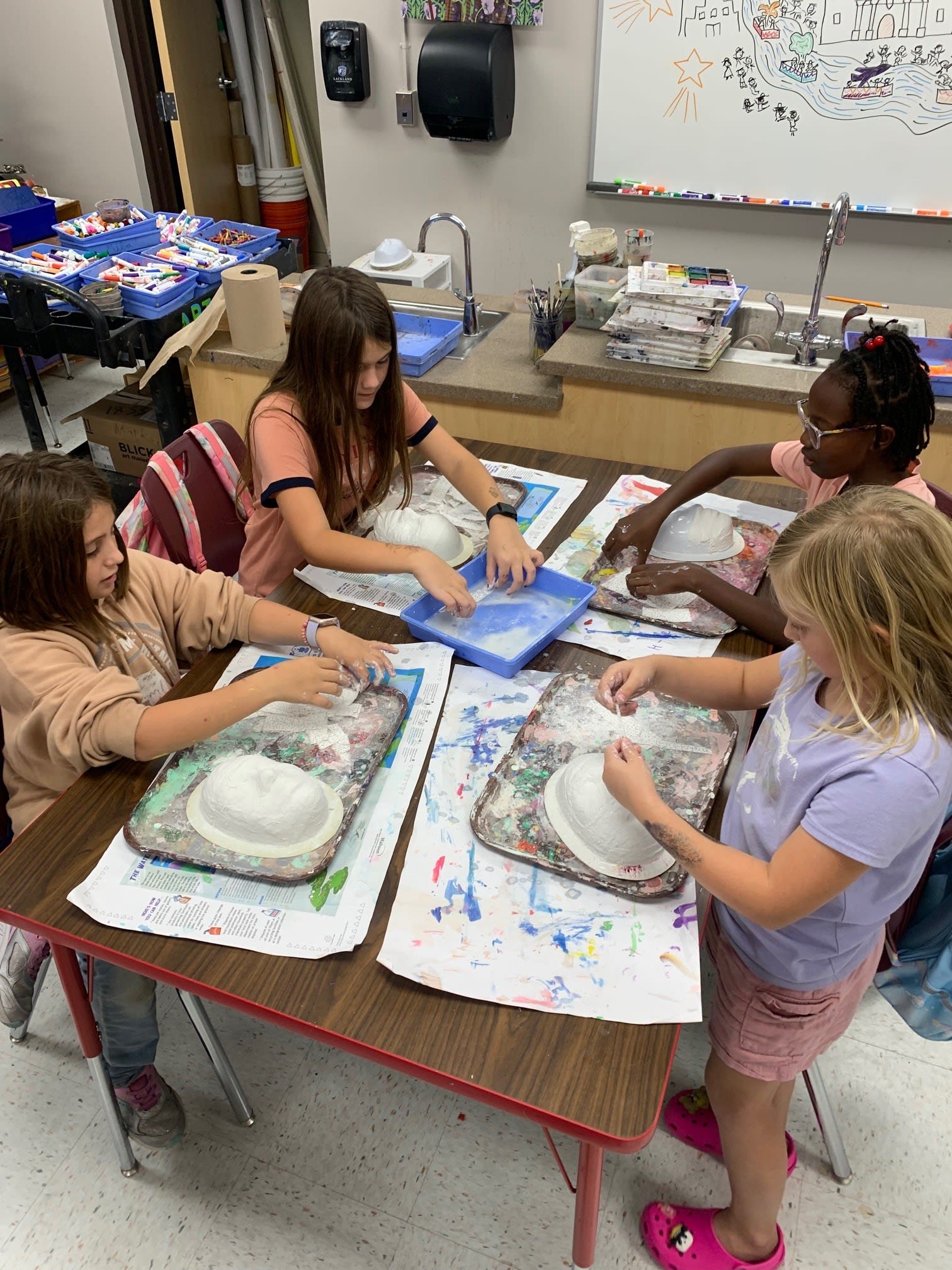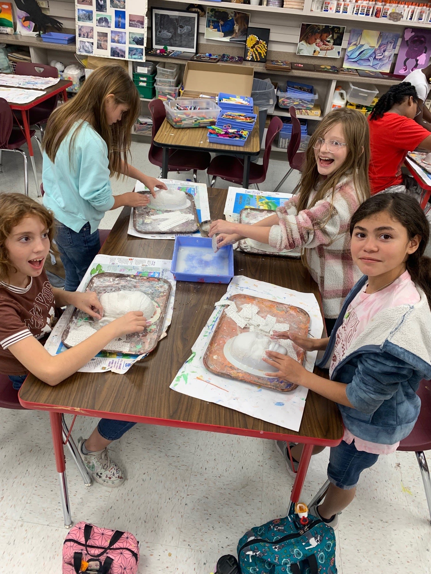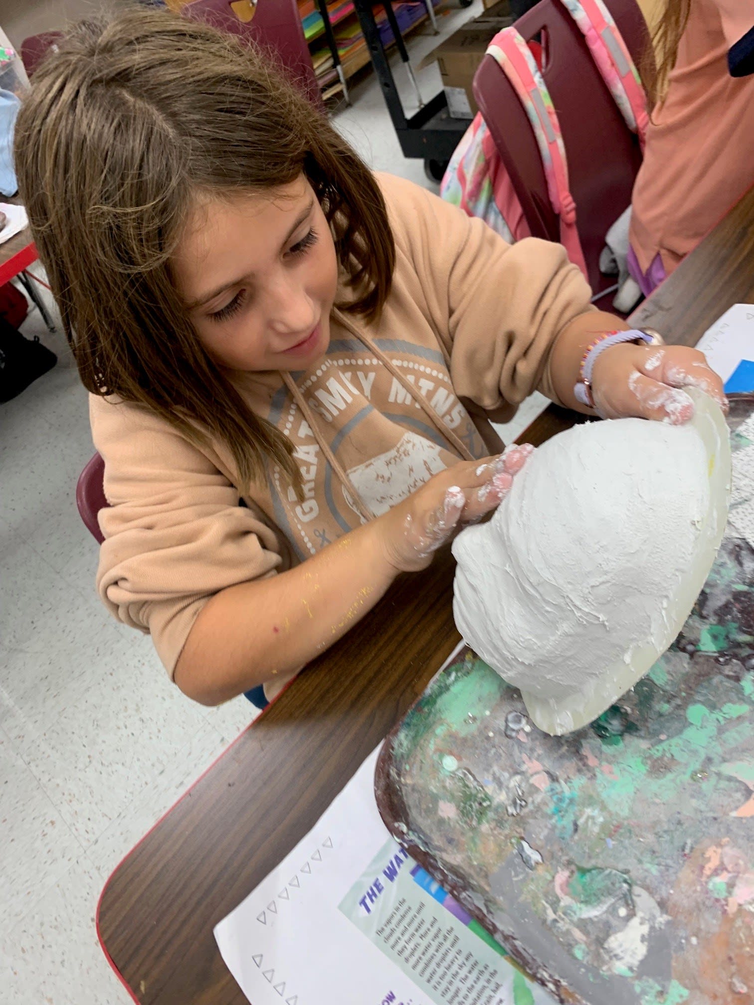4th / 5th grade art club create masks using plaster gauze strips over a face armature. |