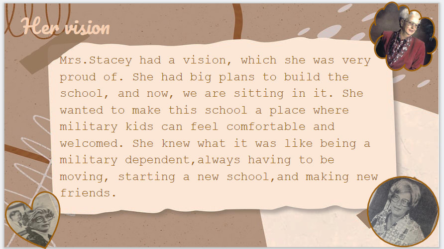The connections made by the students from this project has led them to not only have a deeper appreciation of their school's namesake, but to plan their first community service project. Mrs. Stacey had a vision of a "Camelot" environment for all of the military connected children that passed through this district. She wanted a lot of green space with flowers to be enjoyed by all. The AVID students will be partnering up with Ms. Polis and the Garden Club to work on the flower beds already built around campus and want to eventually build more. We will also be partnering up With Mrs. Duron's Community Service class to bring back and old tradition of celebrating Mrs. Stacey's birthday in April with cupcakes for all.