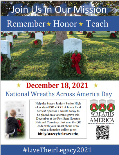 This year Mrs. Duron’s Family and Community Service class is selling wreaths in support of Wreaths Across America. The wreaths will be placed on the graves of veterans here at Fort Sam and throughout the United States on December 18th. This year Wreaths Across America added some new options to remember our heroes. Wreaths can be purchased in honor of a living veteran, spouse, first responder or in remembrance of a veteran who has passed. You can also buy a wreath to be placed on a specific grave. If you don’t know of a person to honor – you can still buy a wreath to be placed on a grave. I am sure it will be appreciated by the families of those who have passed. To access these options, the wreath MUST be purchased online. The link to purchase online is bit.ly/staceyfcclawreaths If you do not wish to buy online, we have a paper form that can be completed and turned into Mrs. Duron with payment (cash or check) or can also be mailed. In order for wreaths to be placed this December, all sales need to be processed in November. We appreciate your support. The money raised will be used to complete service projects throughout the year.
