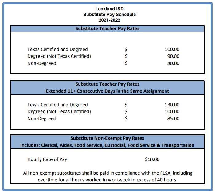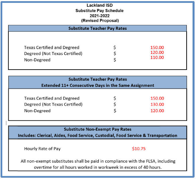 Lackland ISD recognizes the importance of having qualified substitutes to ensure program sustainability in the absence of teachers and staff. The availability of qualified substitutes affords the district the opportunity to support staff absences related to professional development and personal needs, including staff wellness. In the October 26, 2021 Board Meeting, the Lackland ISD Board of Trustees increased substitute pay as follows: