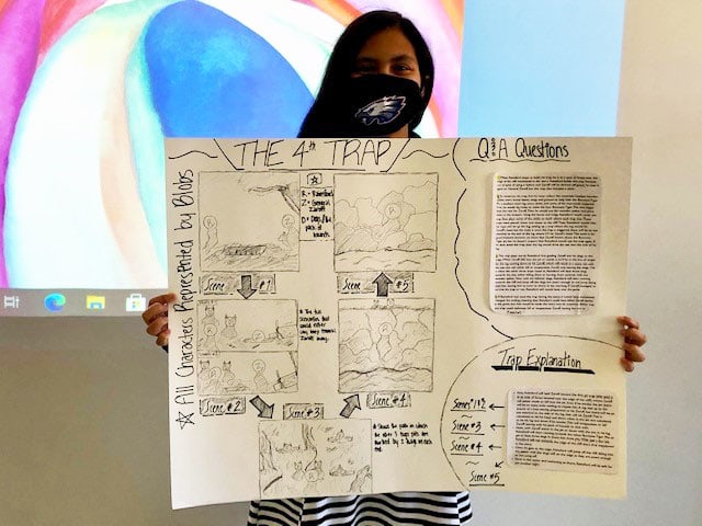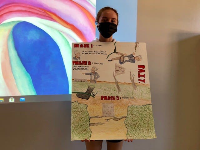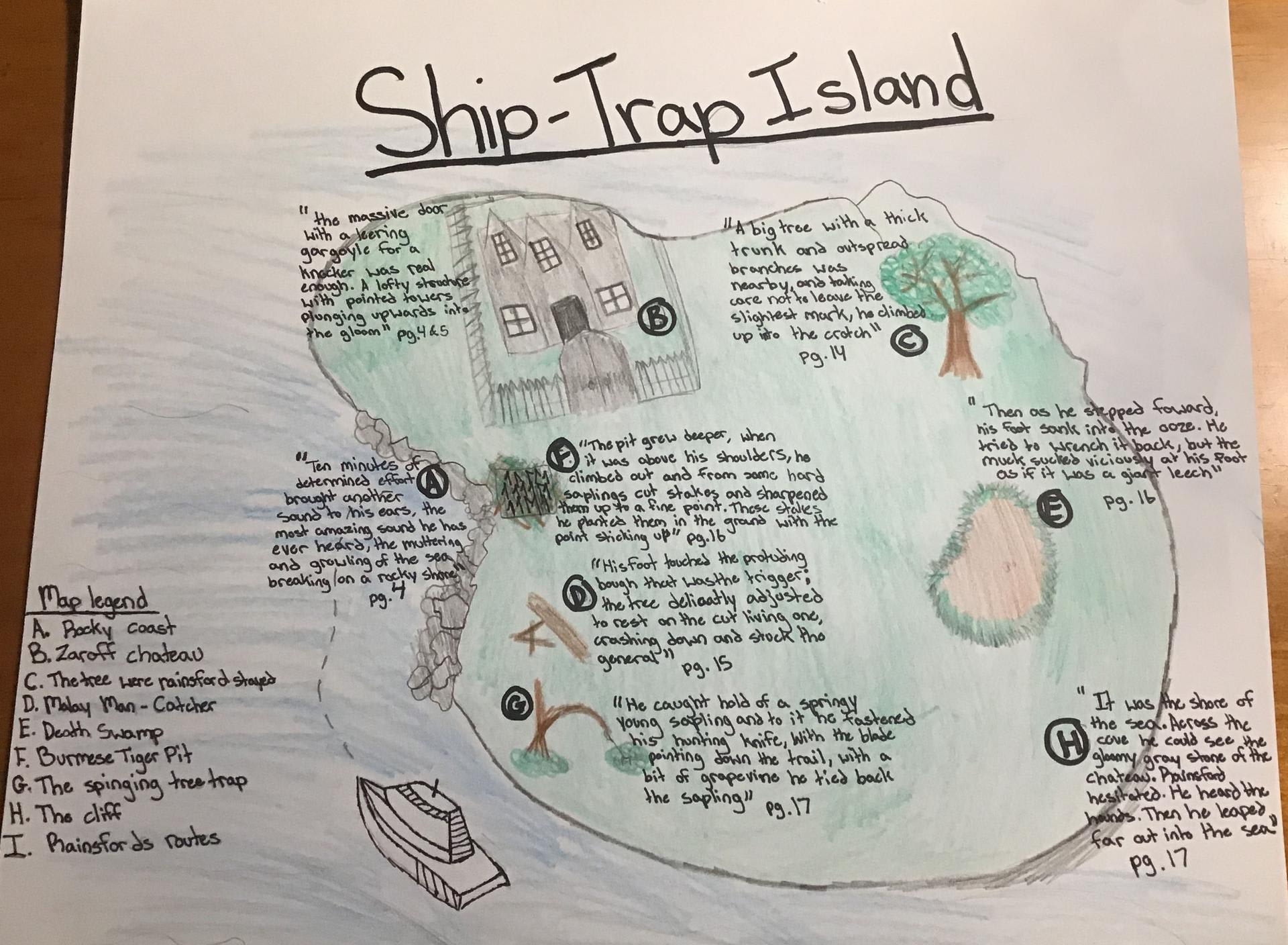 Ms. Gray’s English I class recently completed a “choice” project on the short story The Most Dangerous Game, having the options to create a new trap for the antagonist, General Zaroff, a detailed map of the setting – an island in the Caribbean – with notable locations and a map key, or a body biography of General Zaroff. The new trap was a popular choice, as shown by students Chase Denison, Alyssa Hudson, and Kendall Wilson. The map was created by Julissa Bollinger, and the body biography was created by Isabelle Hopkins.
