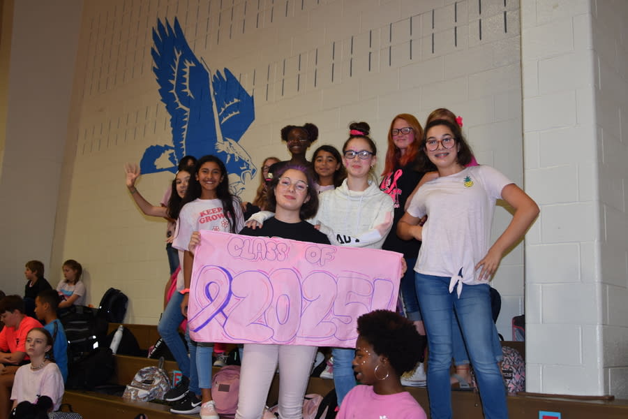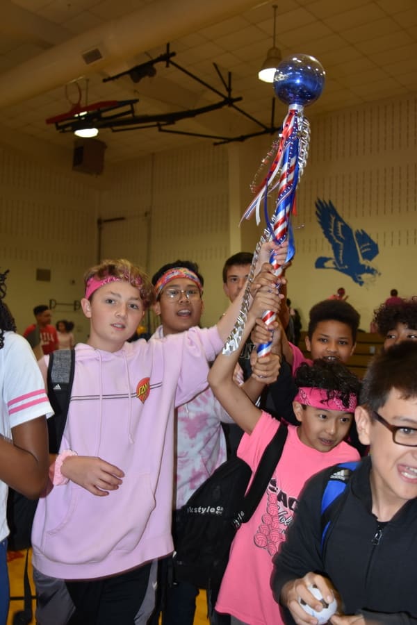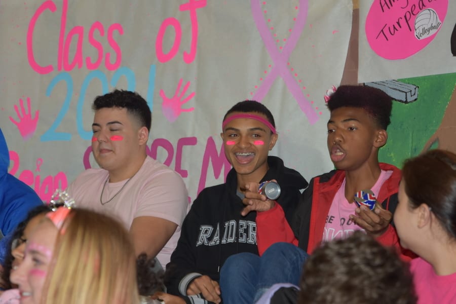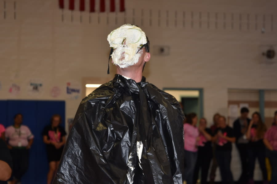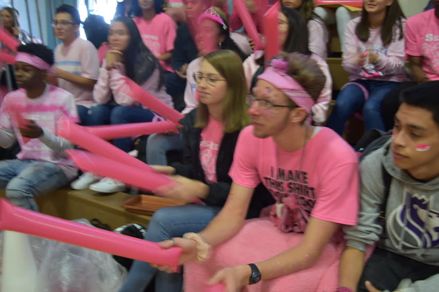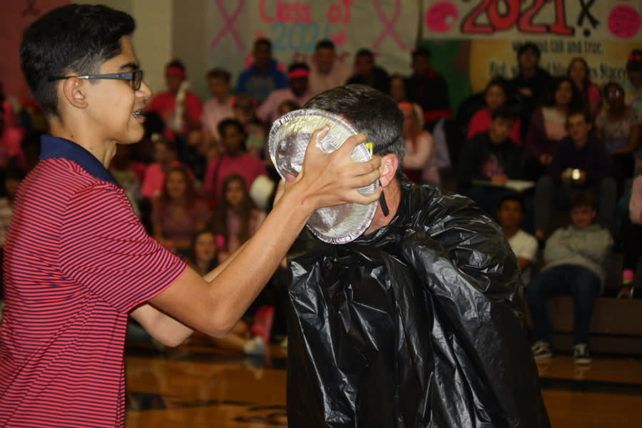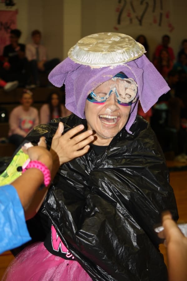 During the Pep Rally, the band and choir performed between games and activities. Volunteers from each grade raced around cones and between hoops in an effort to win the spirit stick. Principal Shelby, Coach Sanchez, and Mrs. Cervantes got the most votes in the pie in the face contest, which meant a face full of whipped cream as students cheered. In the end, the seniors won the high school spirit stick, seventh graders won the middle school spirit stick, and eighth grade won the breast cancer awareness stick.