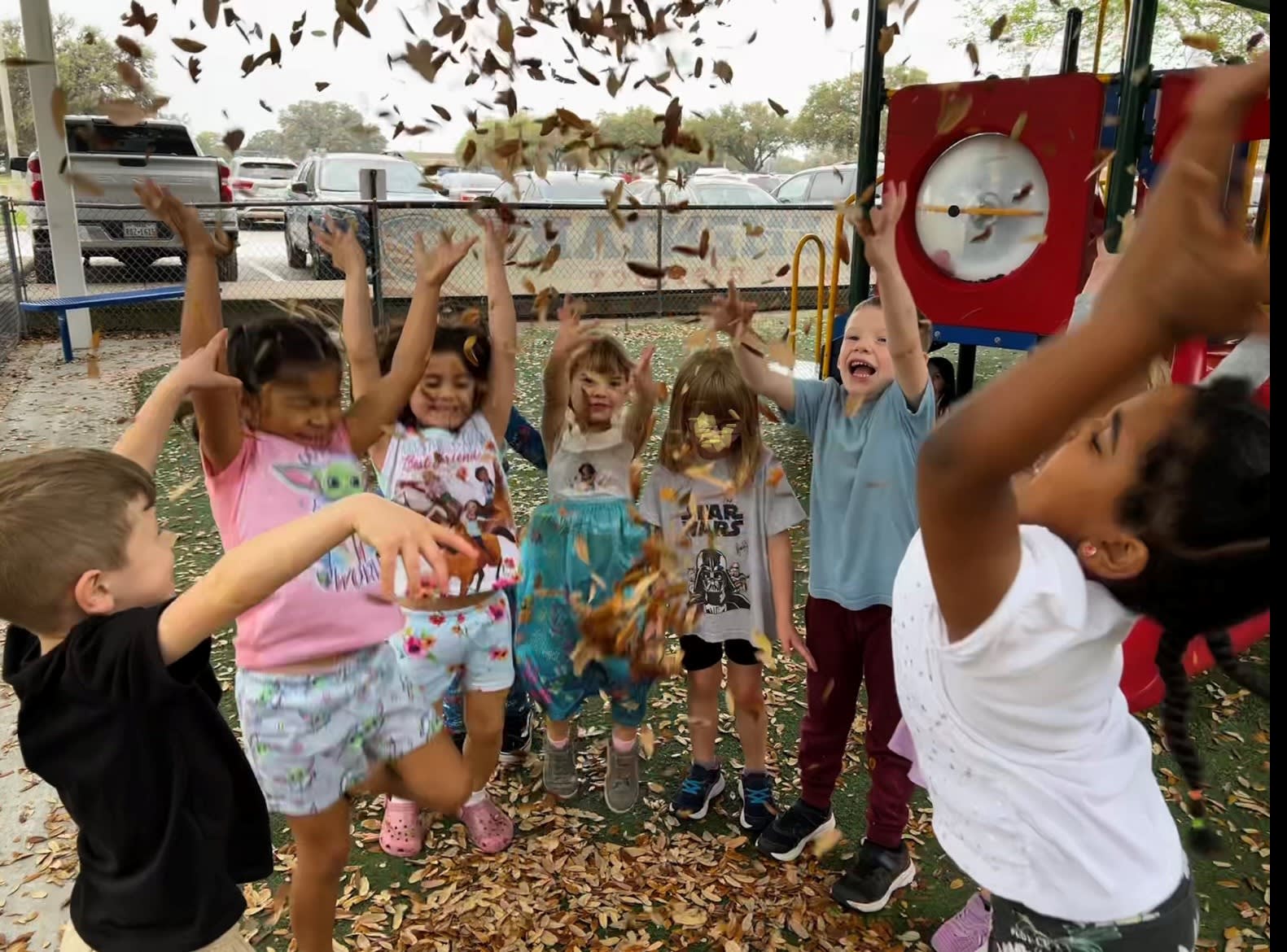 The leaves are falling down, The leaves are falling down, All over Mrs. Silvin’s class,