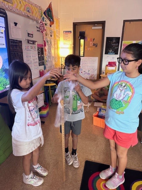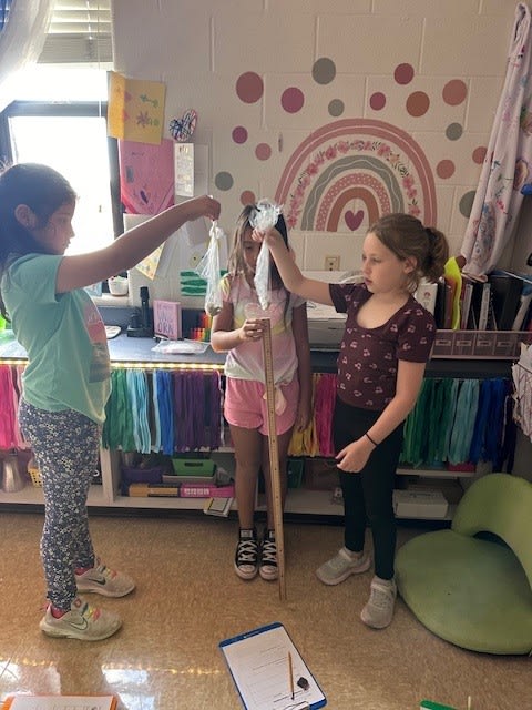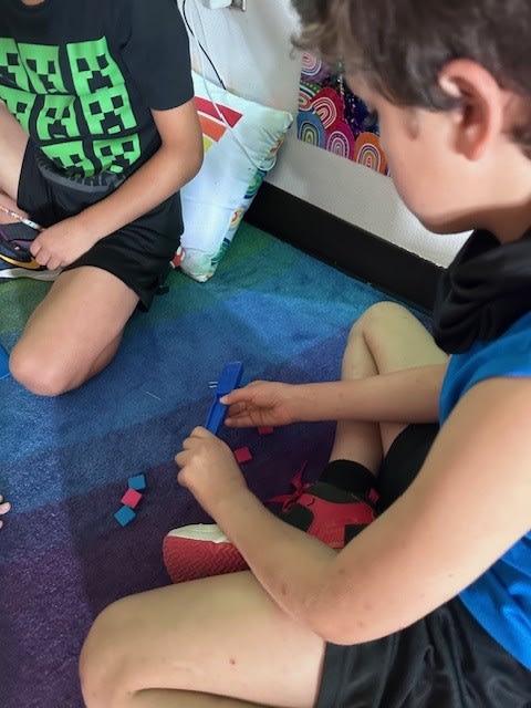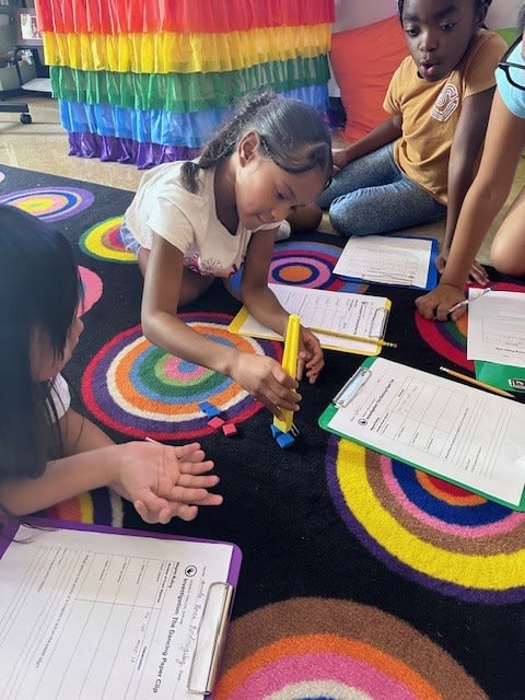 Students put tiles on the paper clip and then observed how the magnet was affected by its distance from the object. |