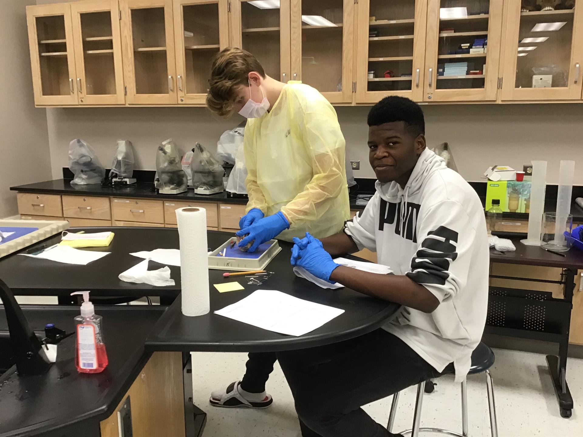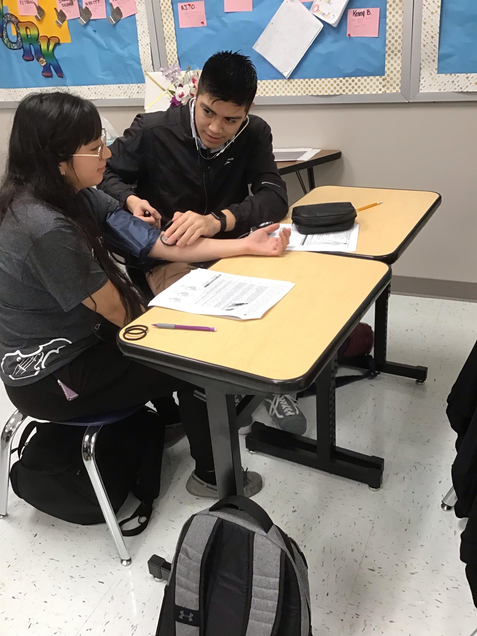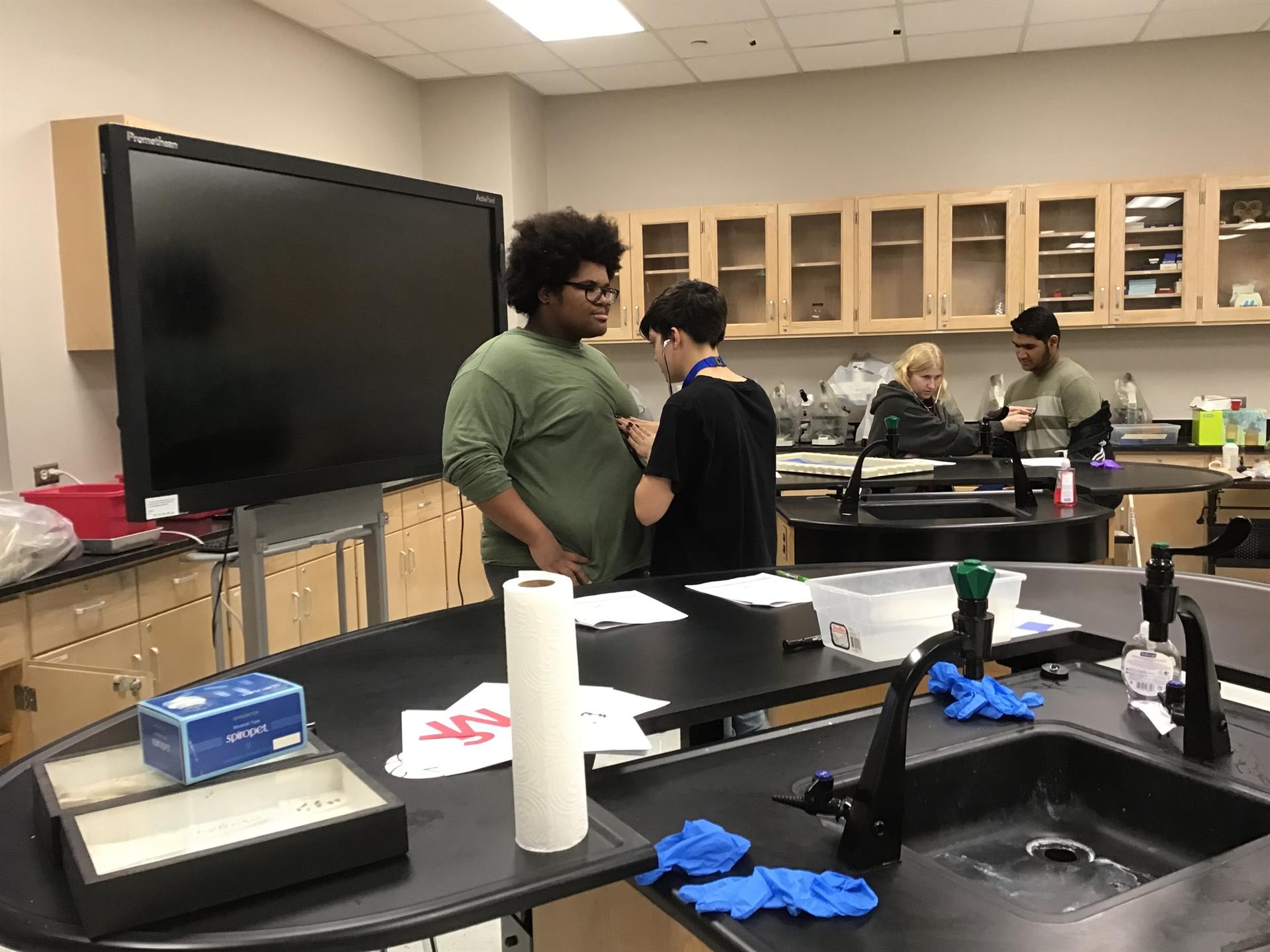 Photography by: Elouise Livingston Students in Ms. Davis’ anatomy class are currently learning about the cardiovascular system. This week students stepped into the “ER” lab and played roles as a heart surgeon and scrub nurse with a patient that needed removal of various heart defects. Students learned how to use medical PPE (personal protective equipment) and tools needed to complete the surgery This week- Students in anatomy class also learned how to take blood pressure and heart rates using stethoscopes and blood pressure cuffs.