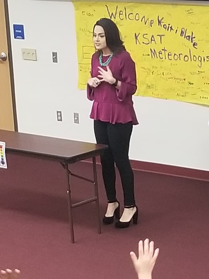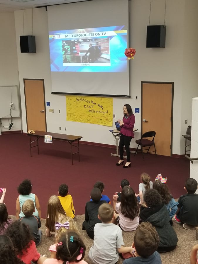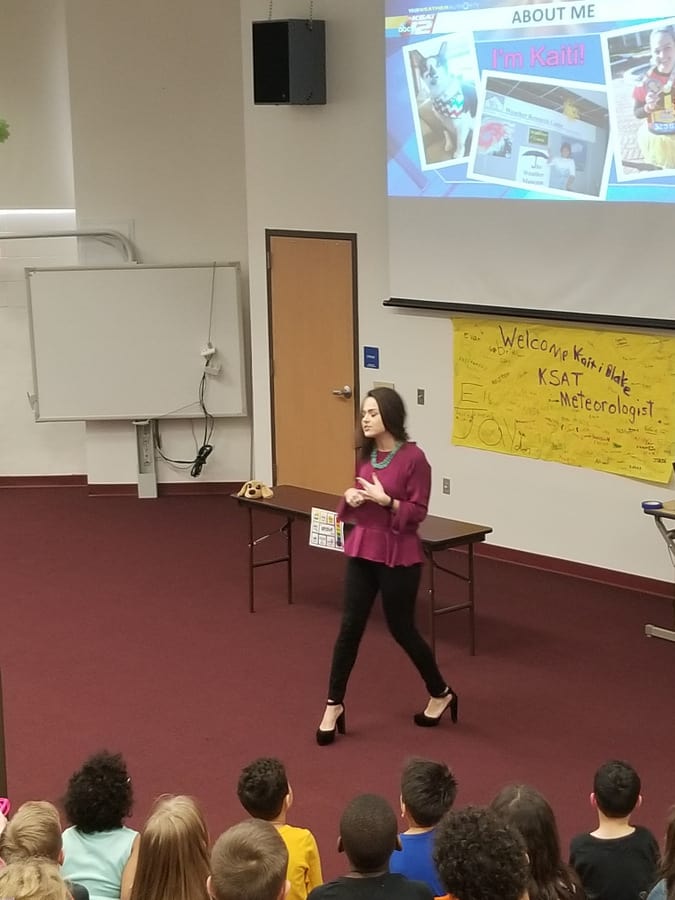 Elementary Happenings First Graders listened to a guest speaker on Thursday, February 7. Ms. Kaiti Blake, KSAT meteorologist, spoke to the students on general weather topics. All first graders have been learning about the weather in science. Thanks for a super talk! We loved it!