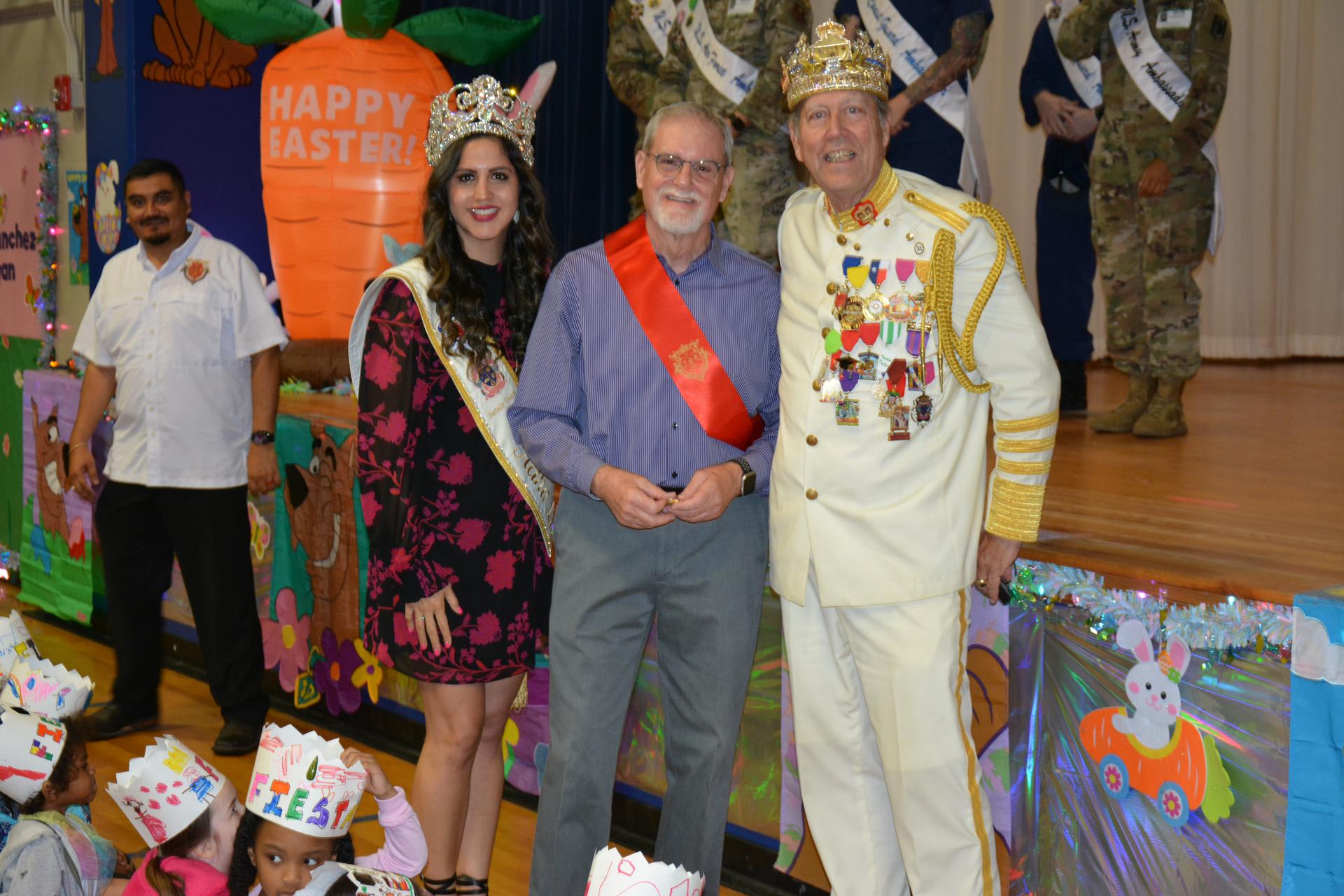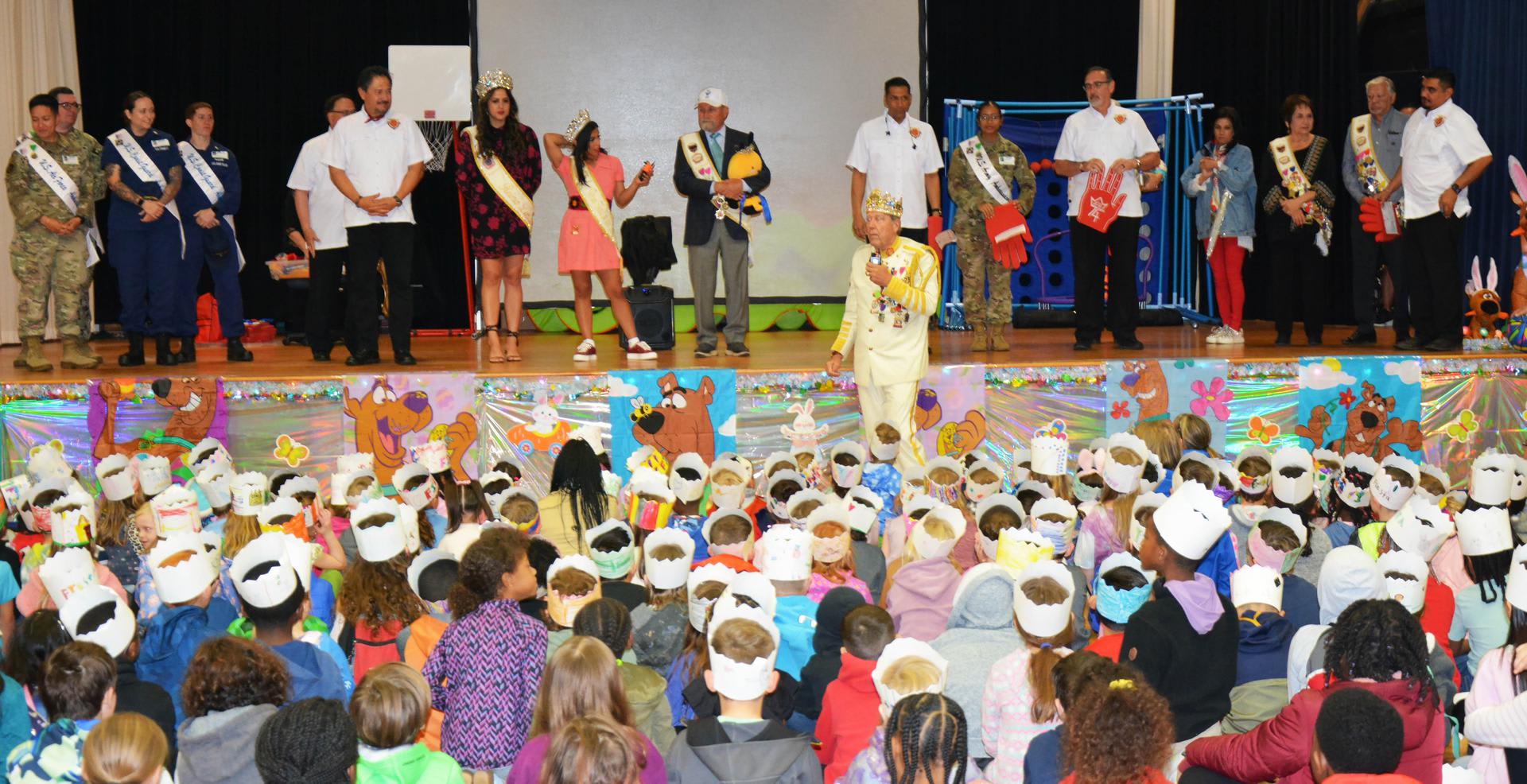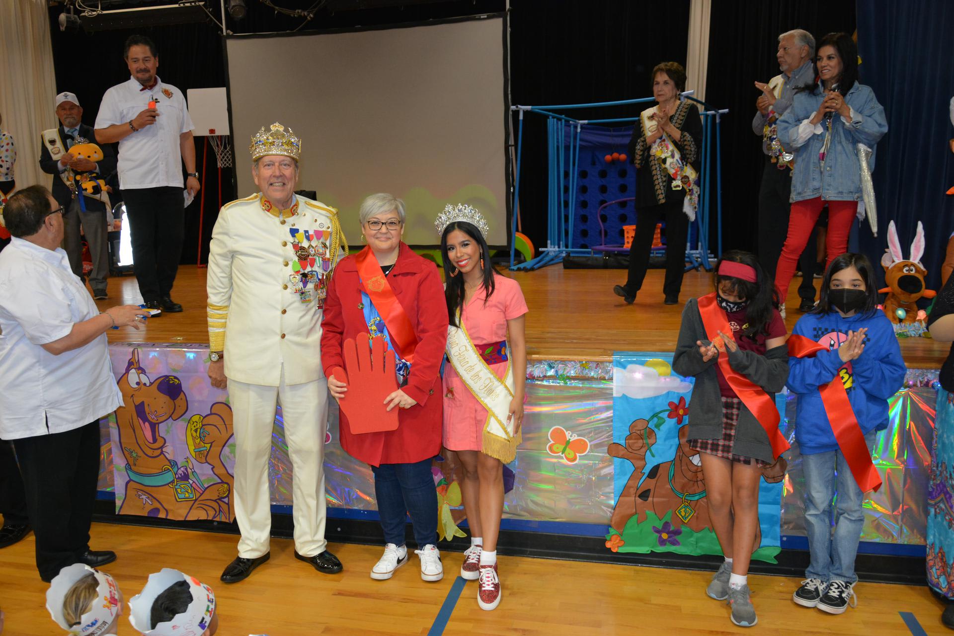 This morning King El Rey Feo and his entourage came to Lackland Elementary School to kick off Fiesta in San Antonio! Students and staff packed the gym wearing their own fiesta crowns and cheered on as the King and his court gave encouraging words and kindness to all! Some teachers and students were recognized for being outstanding this year! Special education teacher Mary Friday, 2nd grade teacher Mr. Patrick Button, librarian Mrs. Tiffany Walderman, elementary principal Mrs. Teresa Leija, top 5th grade boy
