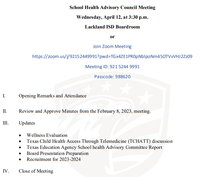 *Wednesday April 12 School Health Advisory Committee meeting 3:30 p.m. at LISD Boardroom