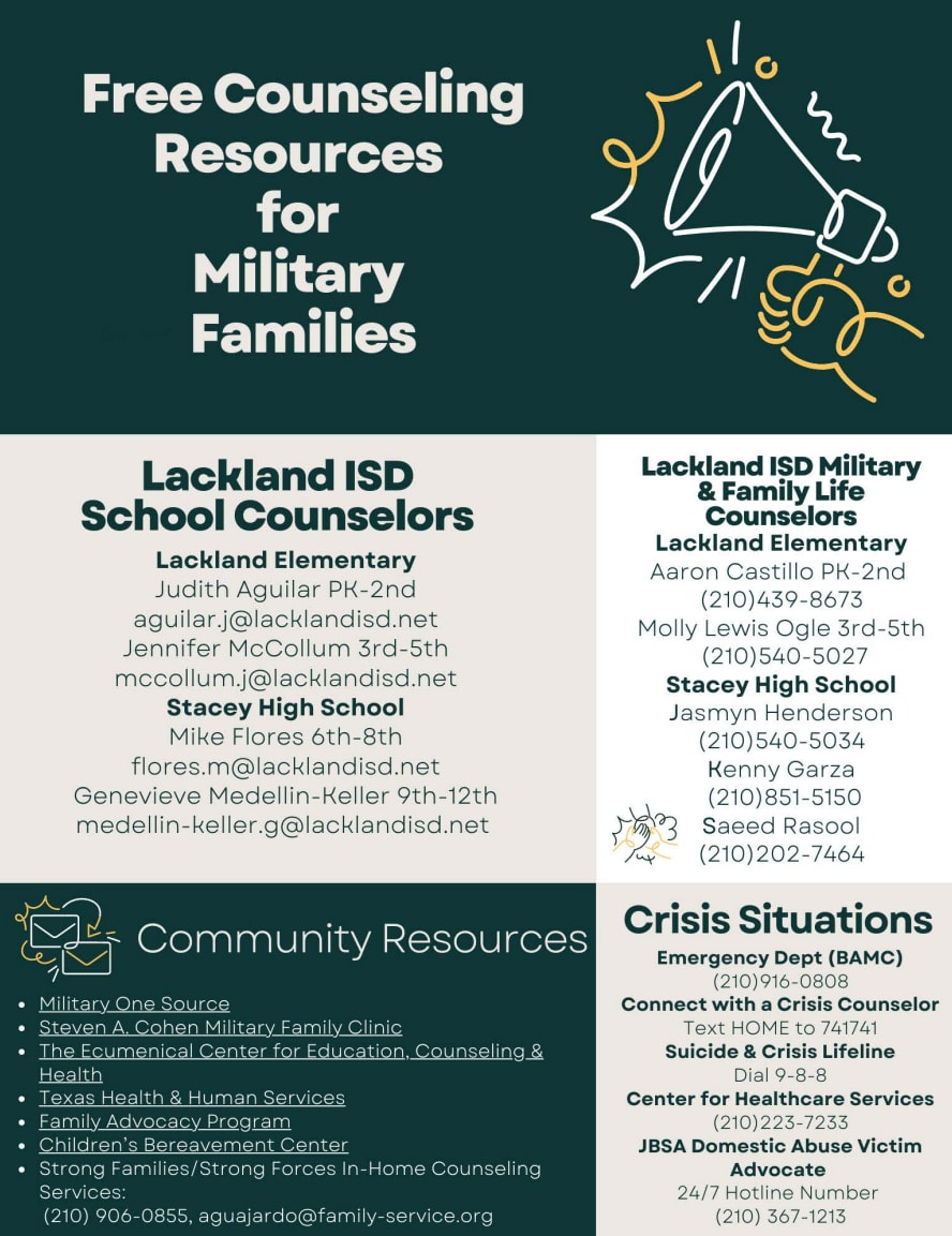 Lackland Elementary School, Mrs. Terry Leija, Leija.t@lacklandisd.net Stacey Jr./Sr High School, Mr. Hunter Shelby, Shelby.h@lacklandisd.net