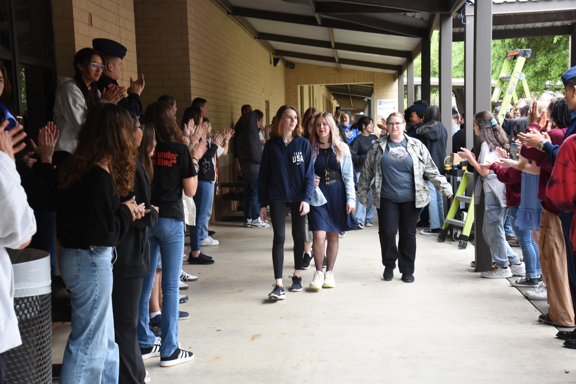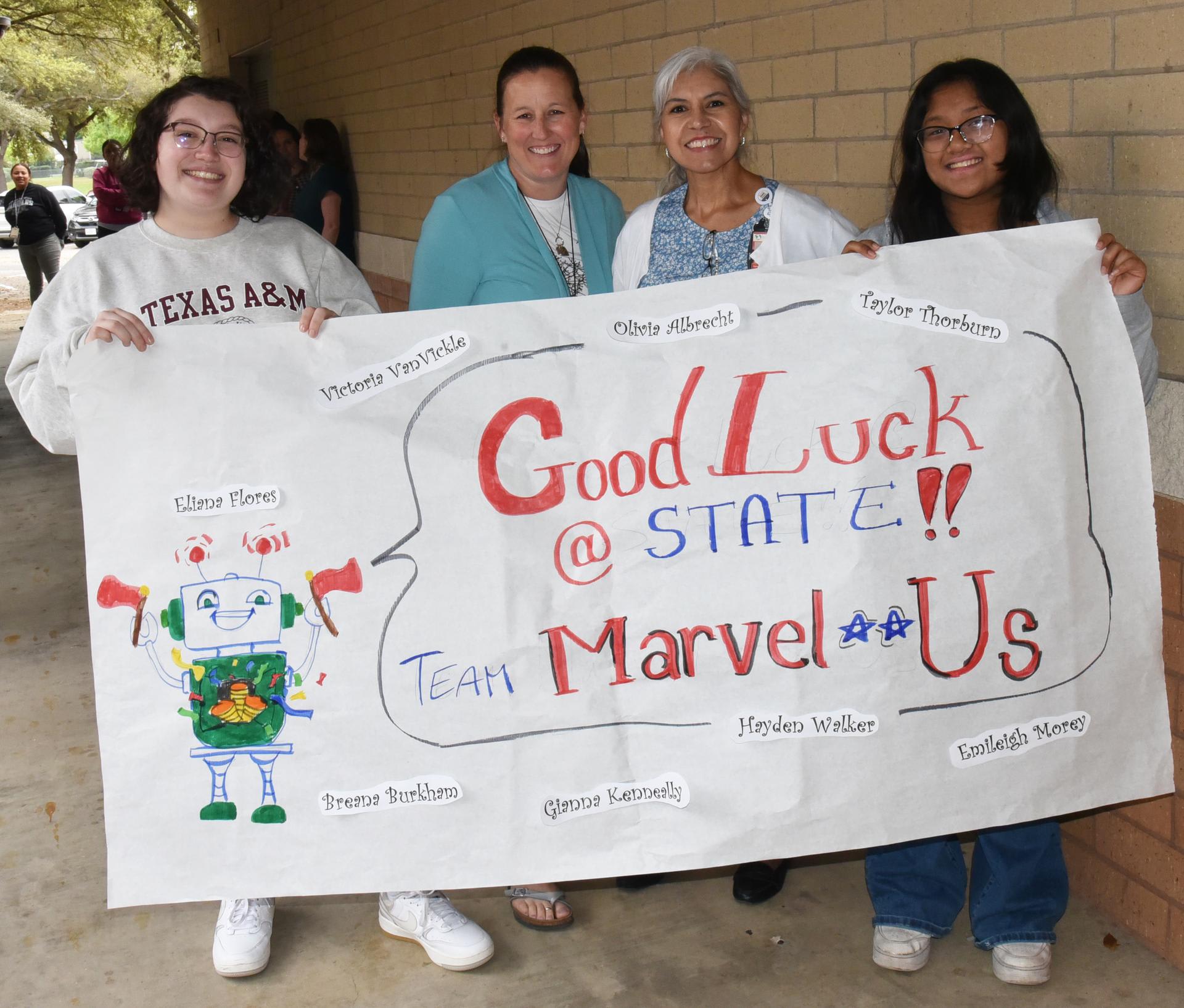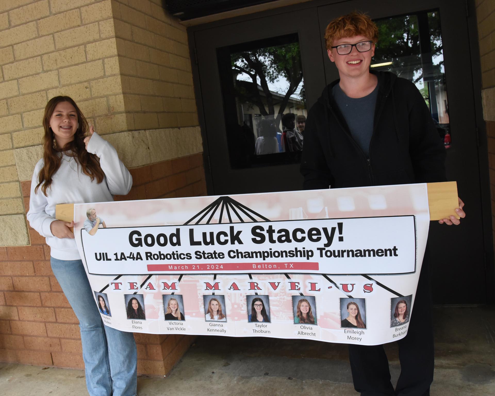 The Stacey student body lined along the walkway on Wednesday to give a warm send-off and wish good luck to the Stacey robotics --Team Marvel-Us. The team will be competing in the UIL 1A-4A Robotics State Championship Tournament in Belton, TX this week. Team members are Victoria Van Vickle, Breana Burkham, Olivia Albrecht, Hayden Walker, Taylor Thoburn, Eliana Flores, Emileigh Morey, Gianna Kenneally. The team coaches are Mr. Kinsey & Mrs. Huerta. Good LUCK!