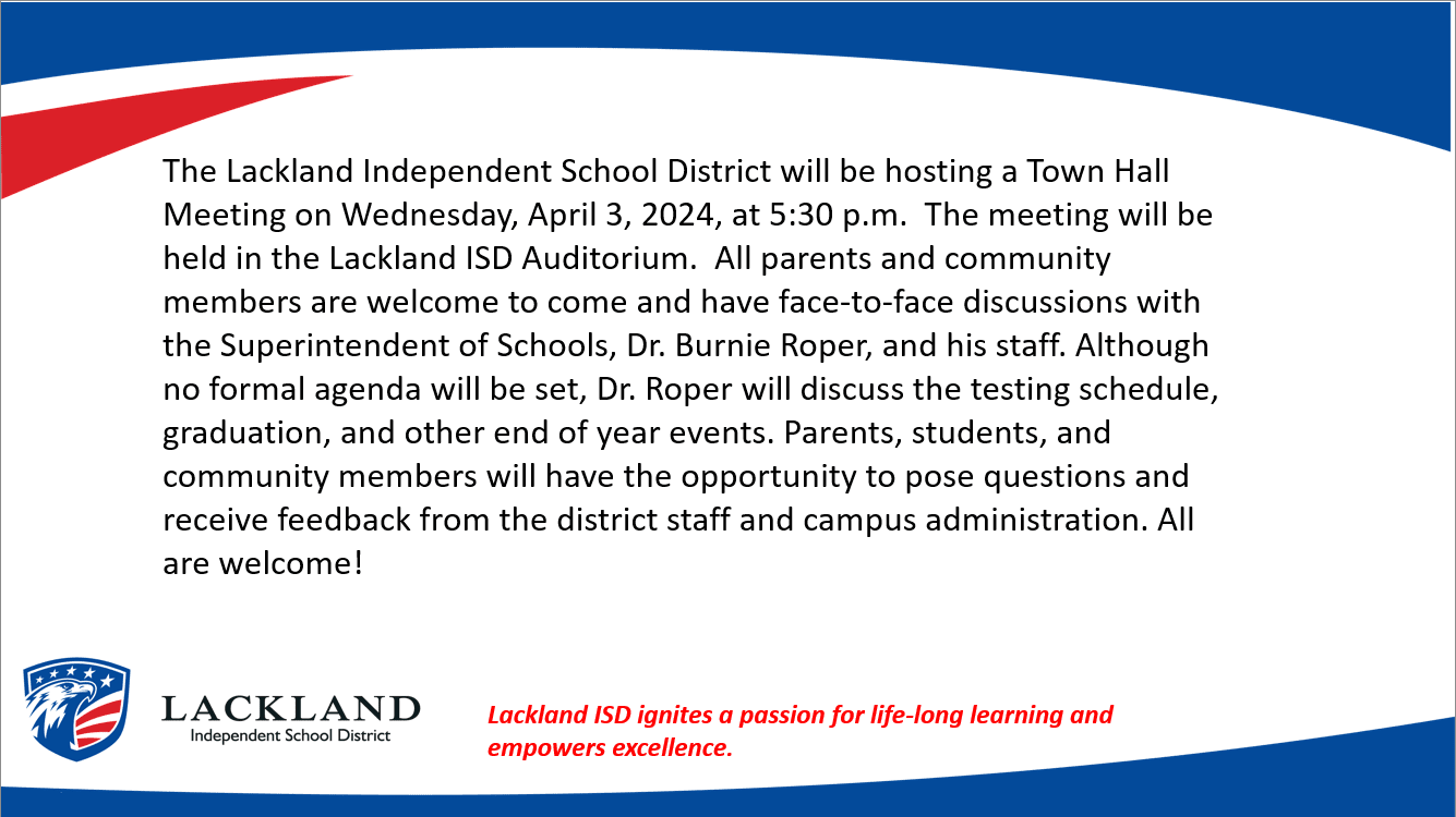 Lackland ISD strongly desires parent engagement. You have an opportunity to share your voice and help us actualize our vision to ignite a passion for life-long learning and empower excellence. As you engage as a parent, we also invite your