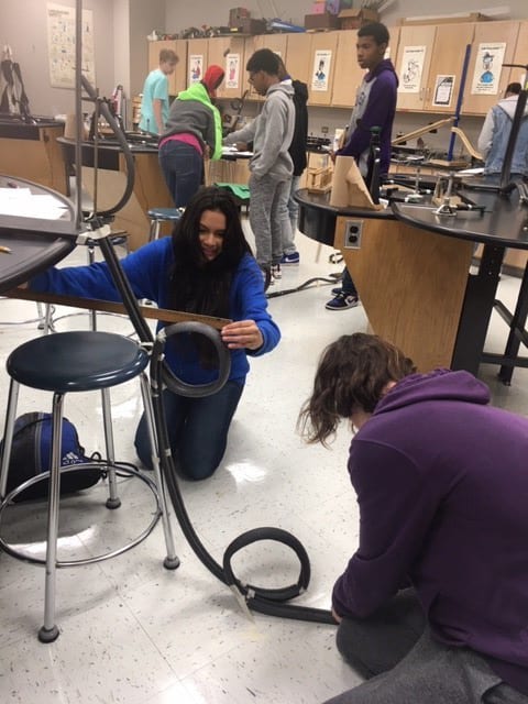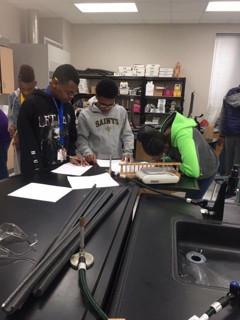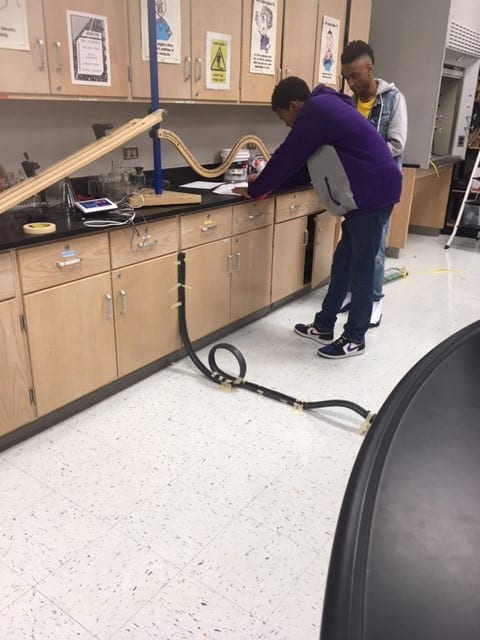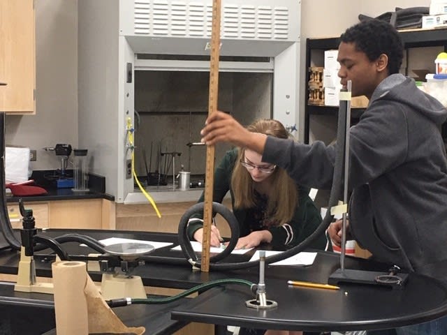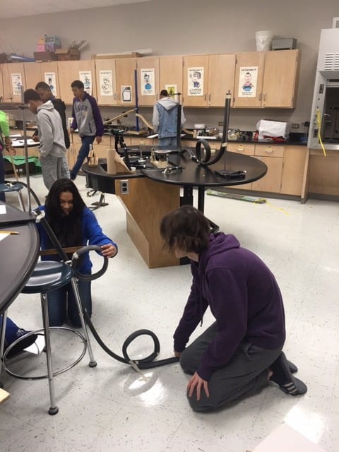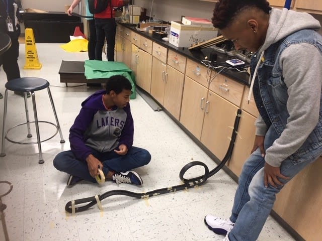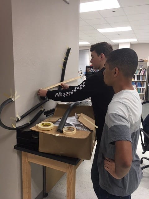 Students in Ms. Templeman's IPC class were completing a physics based lab on momentum by designing and building a roller coaster. They had to design it to meet certain specifications and then take measurements to use for their calculations.