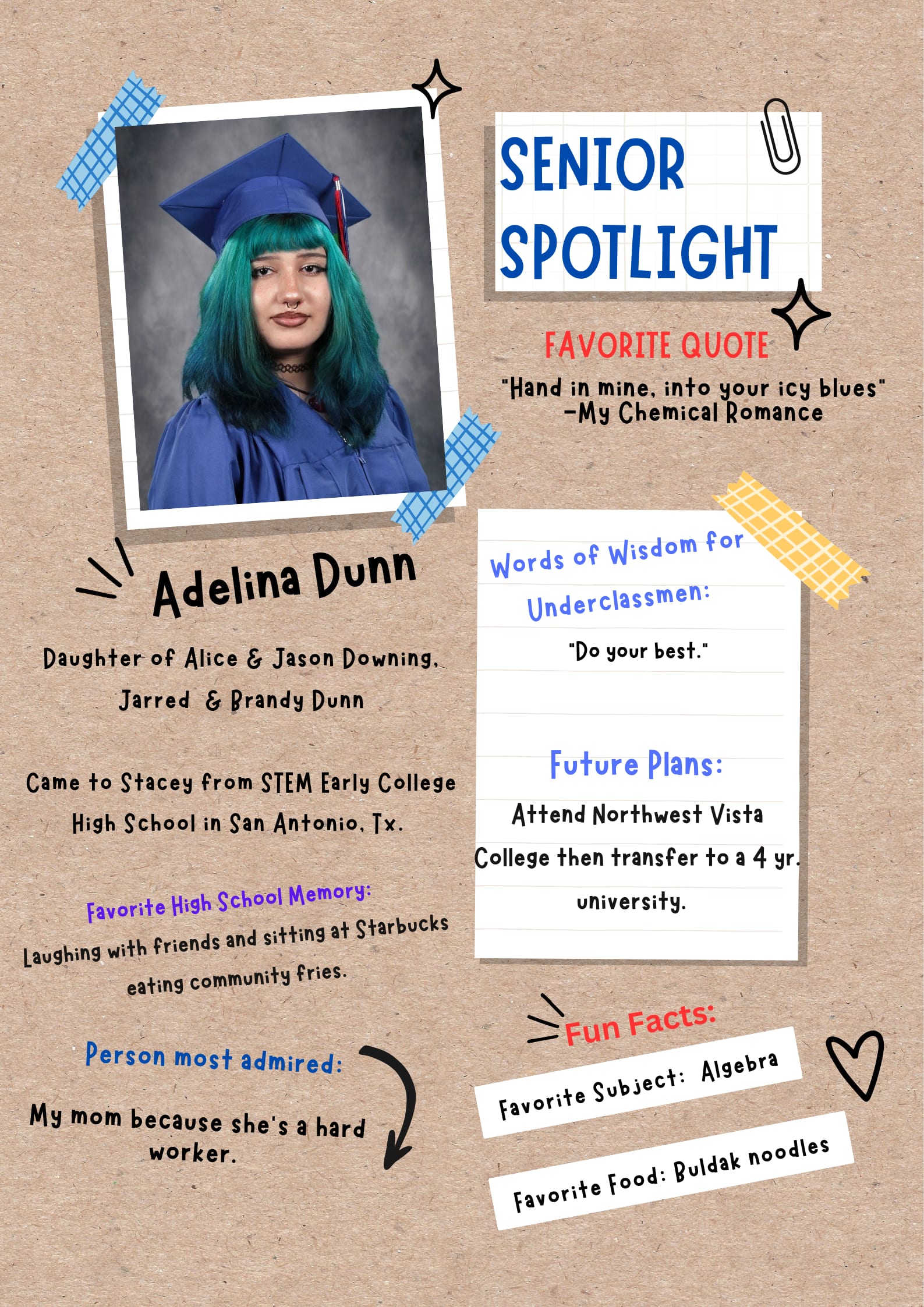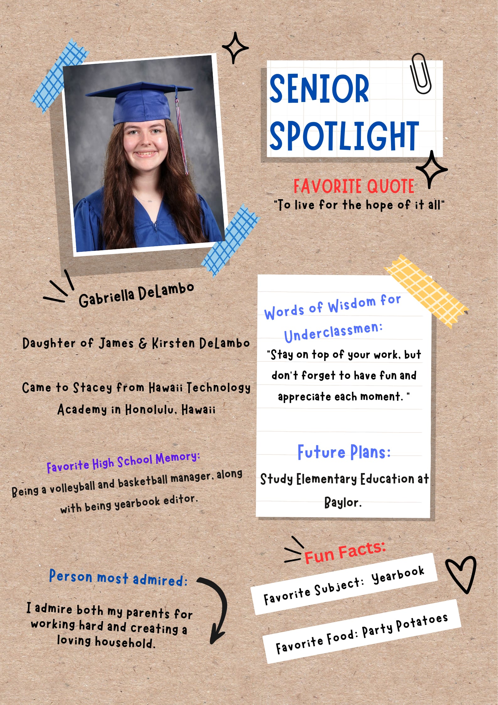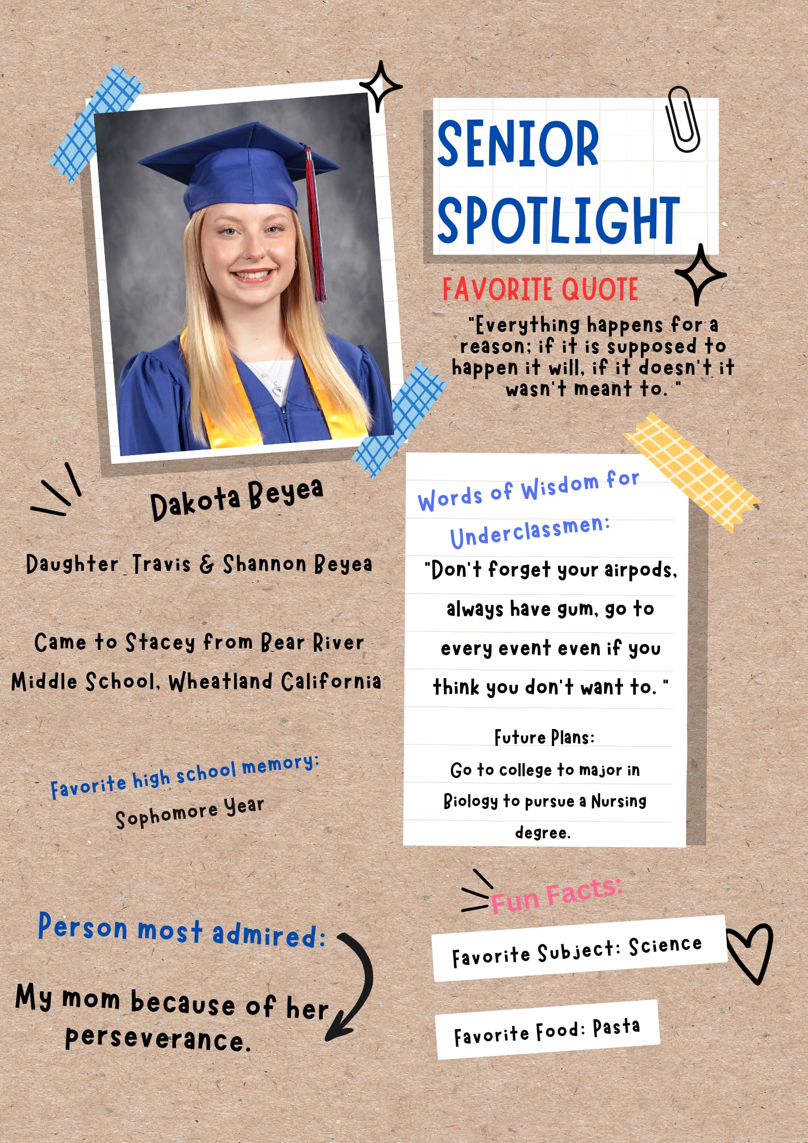 Is there anything in particular that you enjoyed about going to school here? Theatre Tech was an amazing experience with Mr. Richard especially when we built one of the first if not the first two story set. Waking up early or running in the intense heat for Coach Smith built incredible character and huge mental toughness.