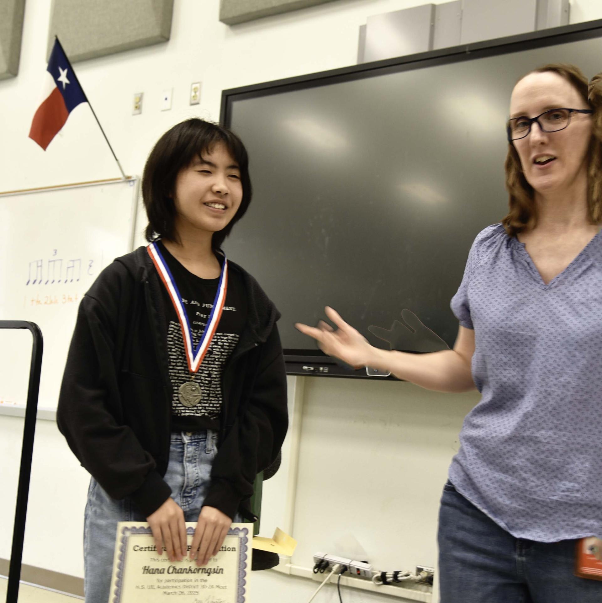 Stacey freshman Hana Chankorngsin won 3rd place in Social Studies at the district UIL High School Academic meet in Falls City. She qualified for regionals but unfortunately will not be able to compete because her family is PCSing to England in the next few weeks. UIL director Christi Palmerton was able to present her district medal and certificate before she left. Congratulations Hana and good luck at your new school!