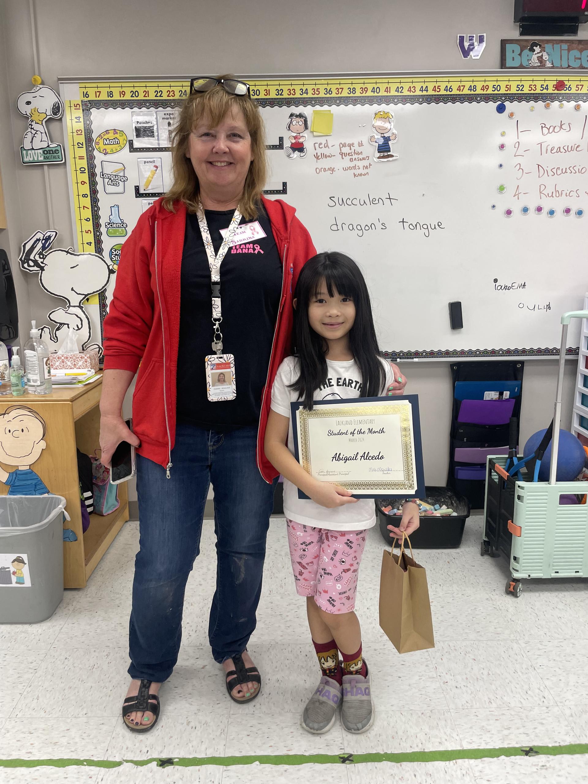 Abigail is a student that cooperates in everything she does! I NEVER have to ask her to come to the carpet, get out her books for a lesson, line up quietly, or be ready for anything that is going to be taking place here at school. She is willing to help her peers, work independently when she can, and ask for help when needed. Abigail is a student that shows cooperation through and through, she works so well with all her peers. This is why I nominate Abigail Alcedo for the character trait of Cooperation!