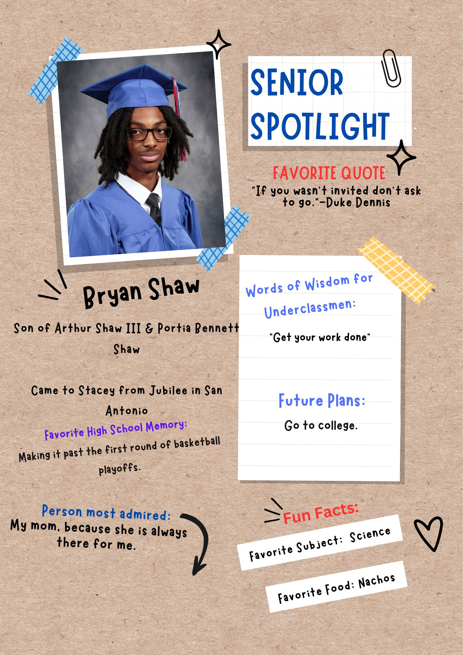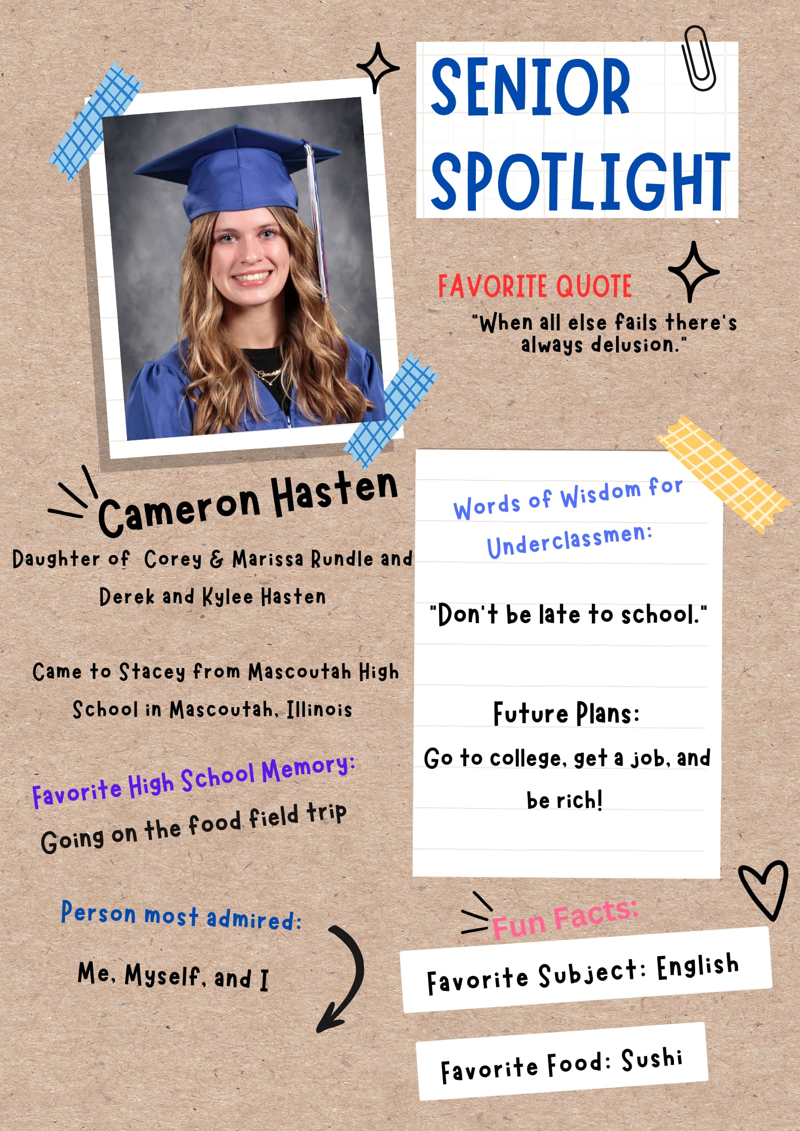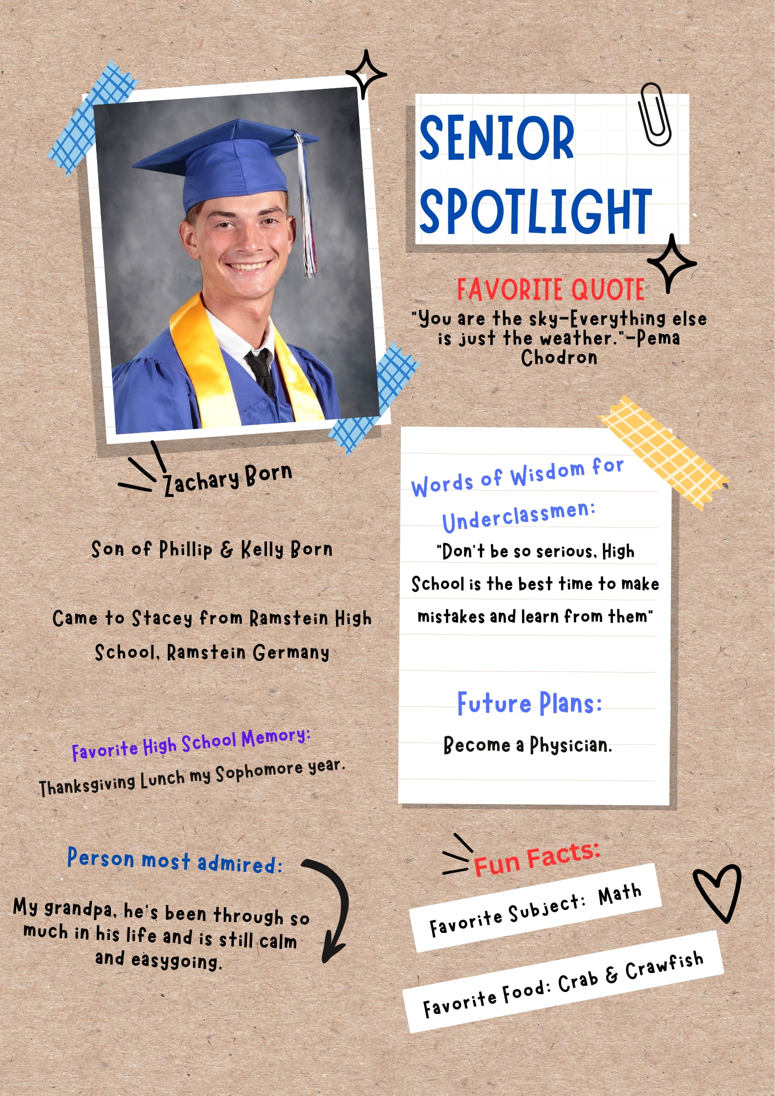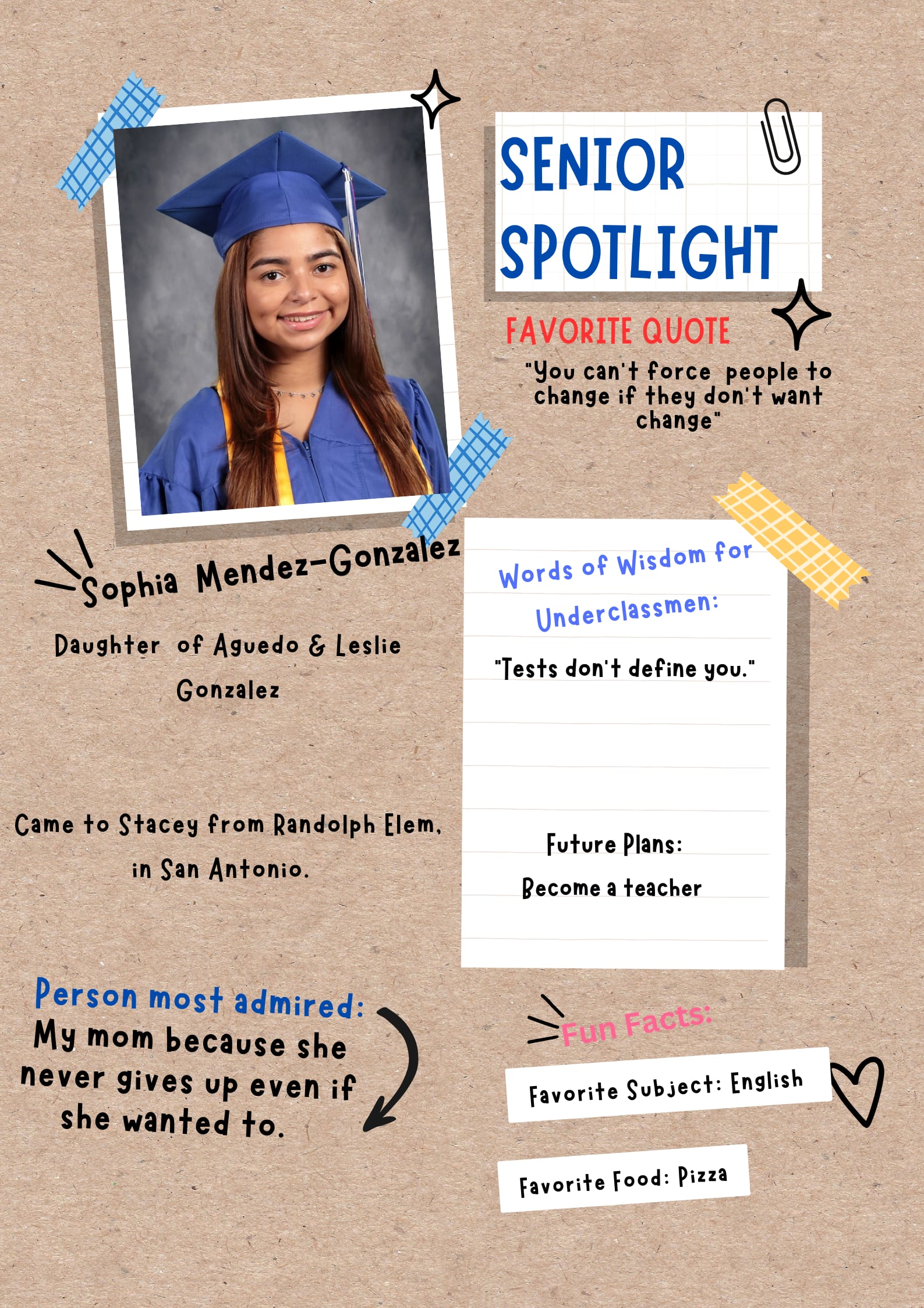 8. What are your plans after you graduate from Stacey? I plan to study sociology in college and get my Bachelor’s degree to hopefully become a social worker or do something in a related field in the future!