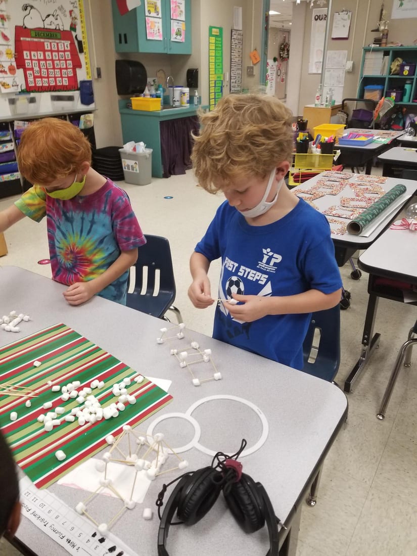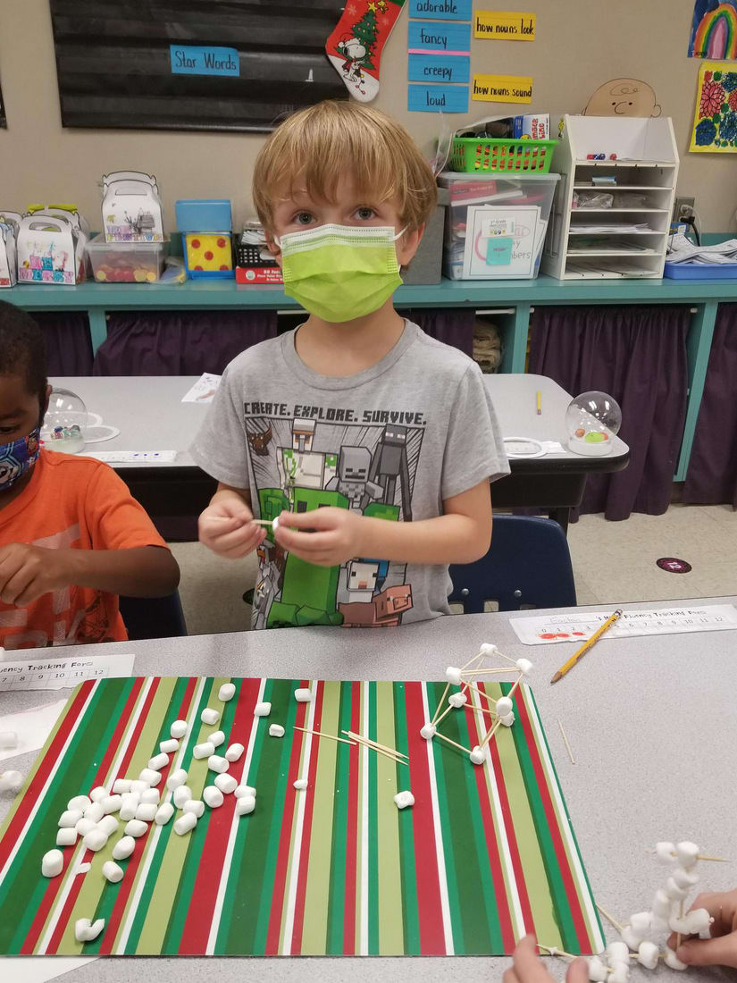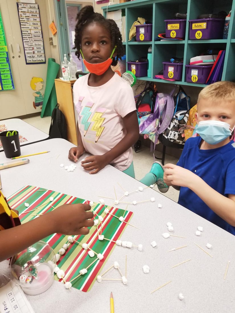 First grade students making a shelf out of toothpicks and marshmallows for Elf on the Shelf. |