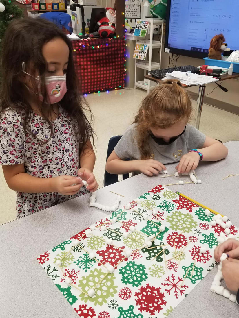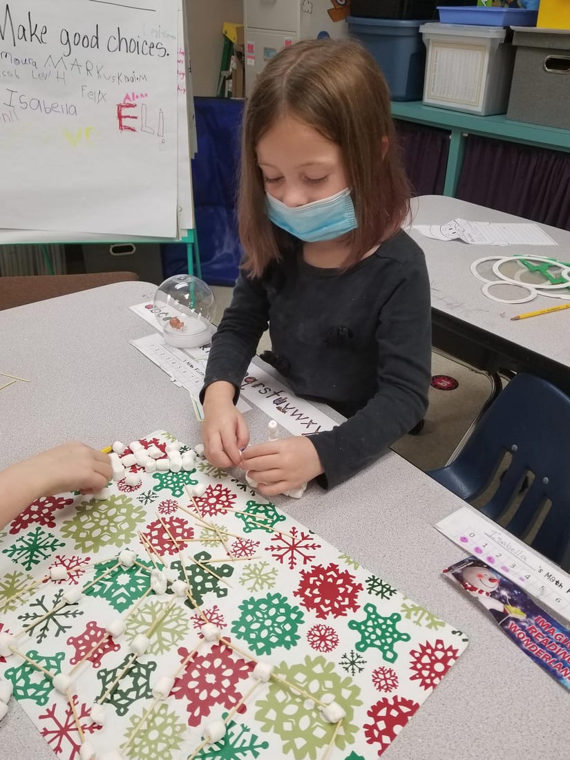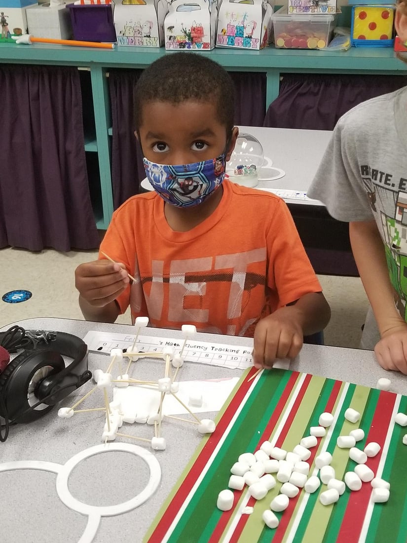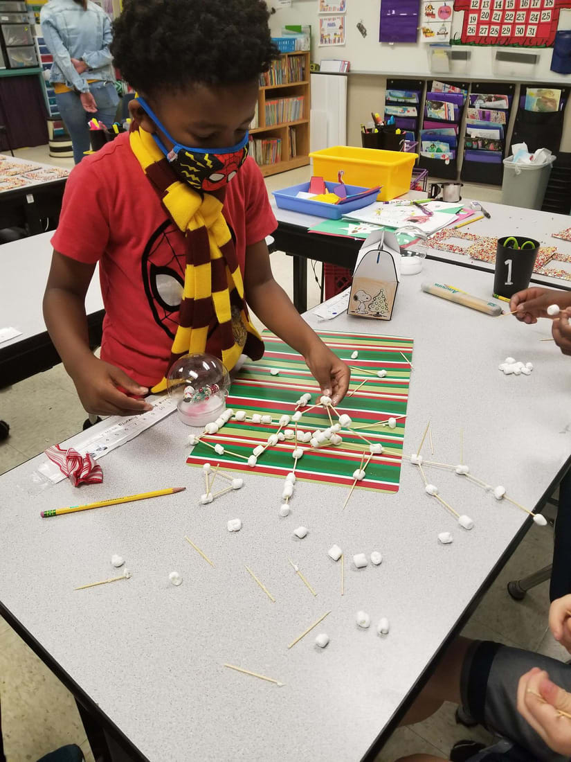 First grade students making a shelf out of toothpicks and marshmallows for Elf on the Shelf. |
