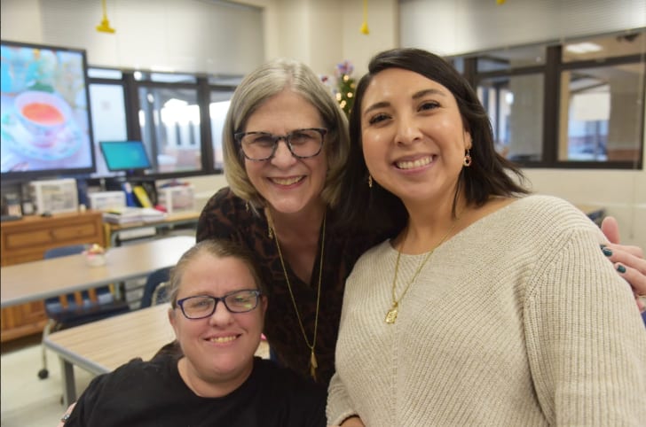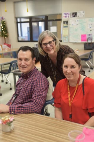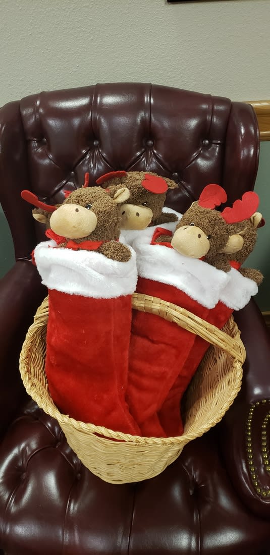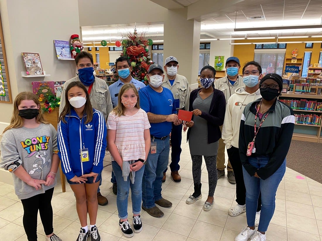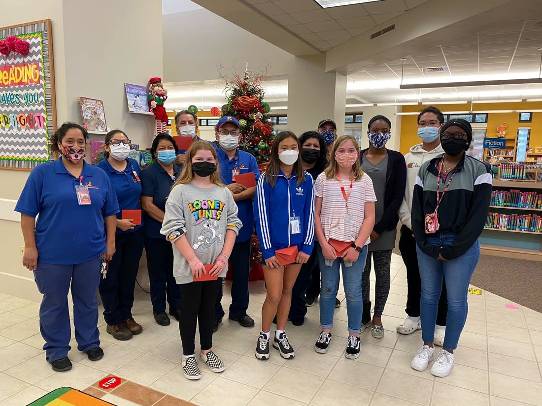 Elementary StuCo officers Flora Davis, Lucy Smith and Savannah Pennington give the custodians and maintenance staff xmas cards from the turkey feather sales. |