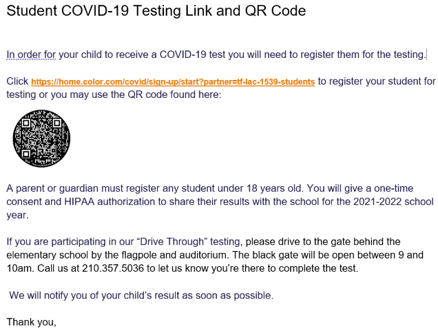 Lackland ISD will be holding a voluntary COVID-19 testing clinic on Tuesday, January 4th, 2022 for any parents that would like their students to be tested prior to coming back on campus on January 5th, 2022. When: Tuesday January 4th- Via “Drive Through” in front of the auditorium using the circle by the flag pole 9-11 AM 1-2:30 PM If you are interested in participating, please email Camille Morales at morales.c@lacklandisd.net to complete the required consent form. We hope you have a HAPPY and SAFE Holiday Season! |