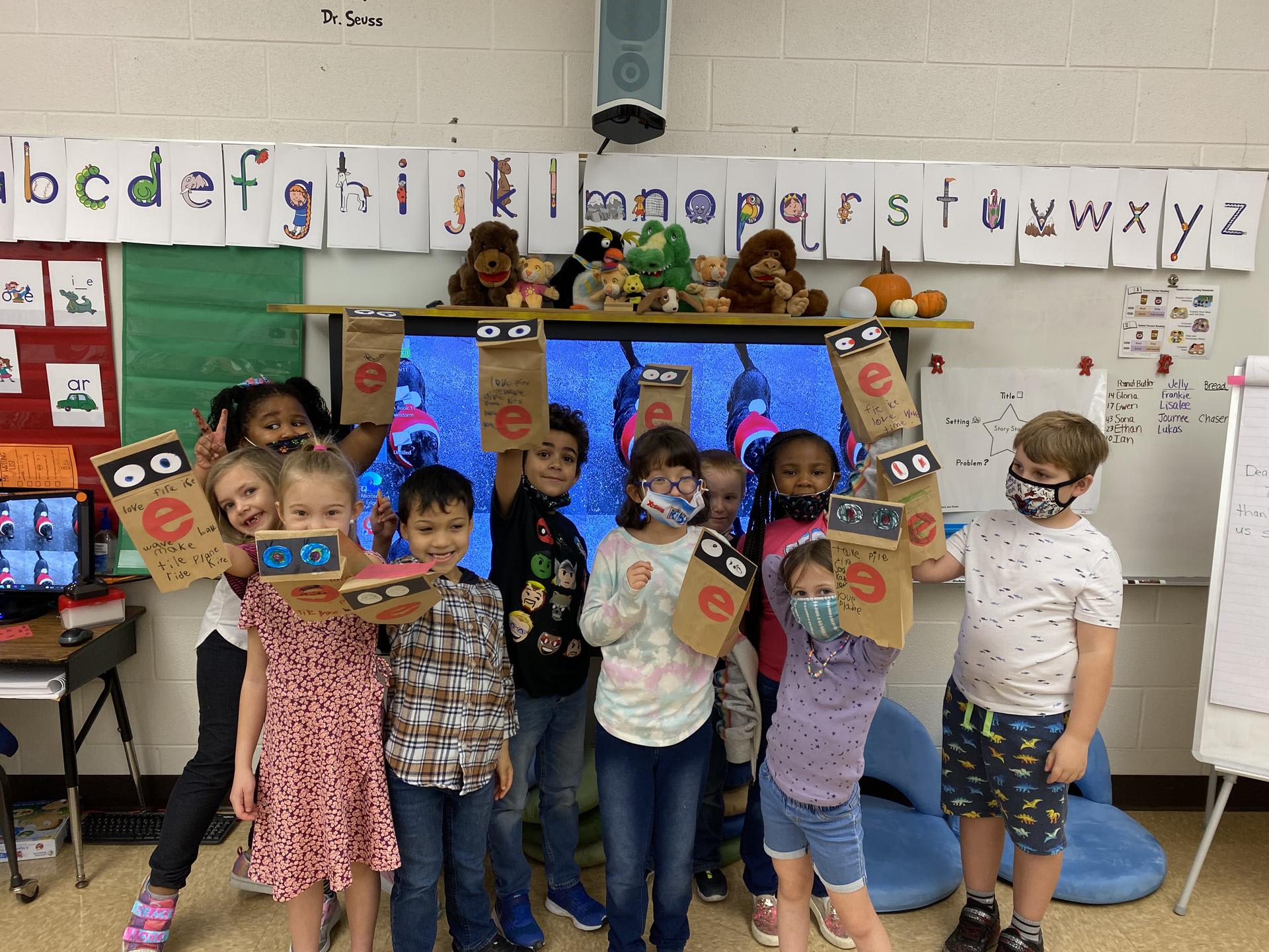 The students in Mrs. Sewell's SFA class finished the semester by making Sneaky e puppets at their end of semester party. The class has been studying the sounds "bake a cake a," "in a while crocodile I" and "phone home o" all of which have that sneaky e hanging around at the end and making the vowel say its name. The crafty puppets even snuck off from reading class and followed the students home. |