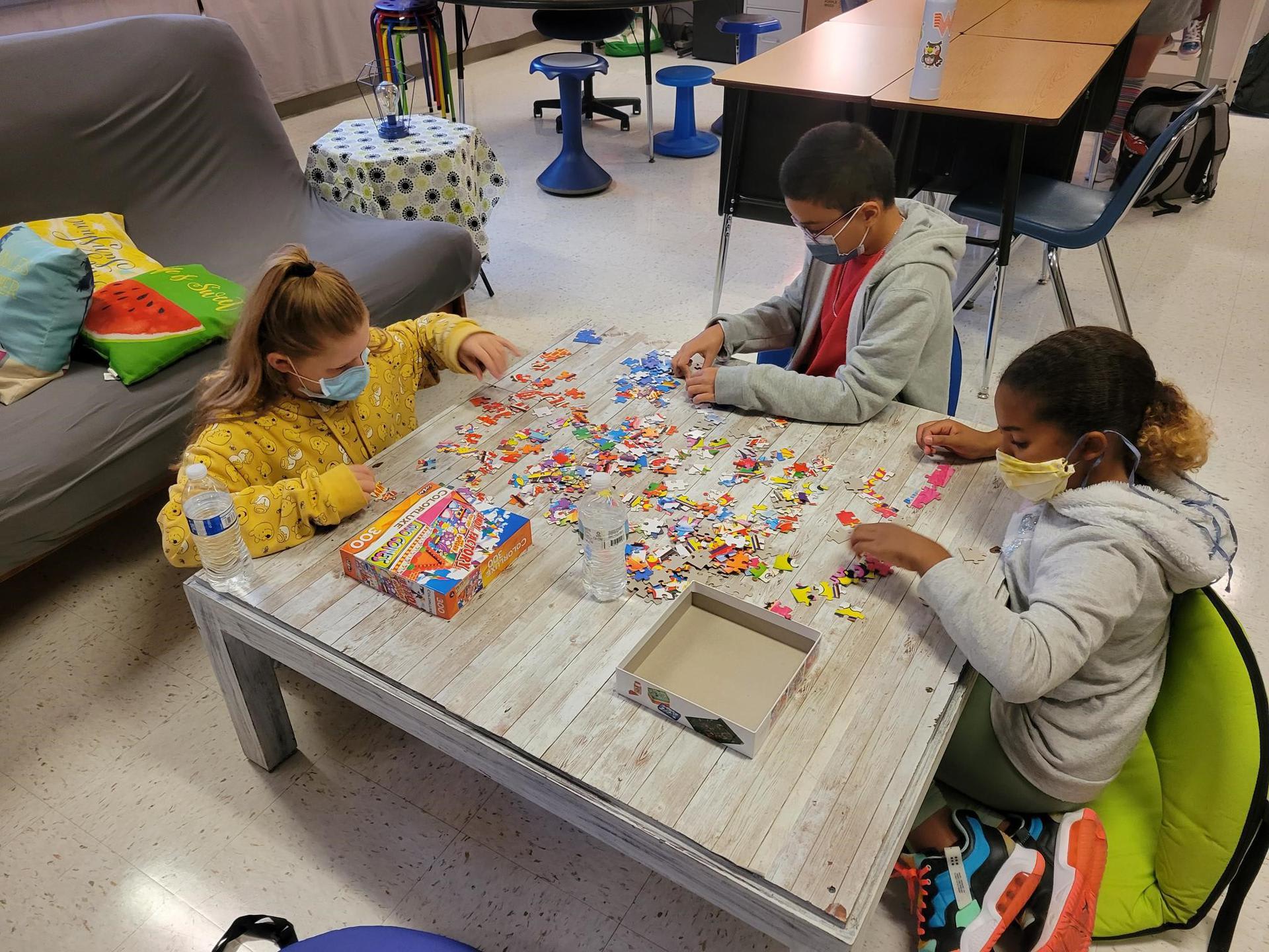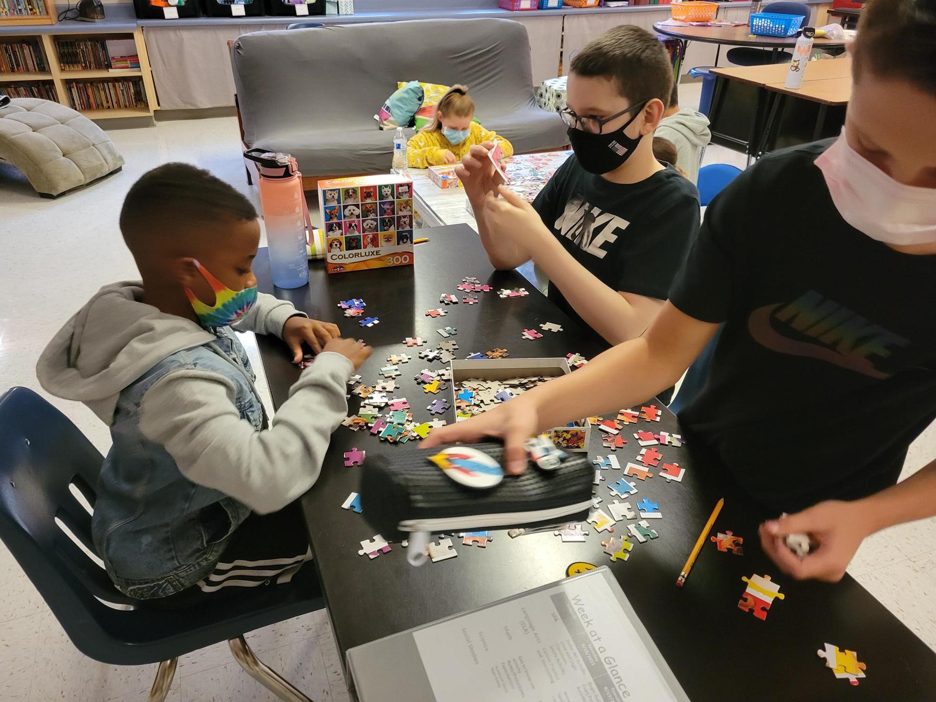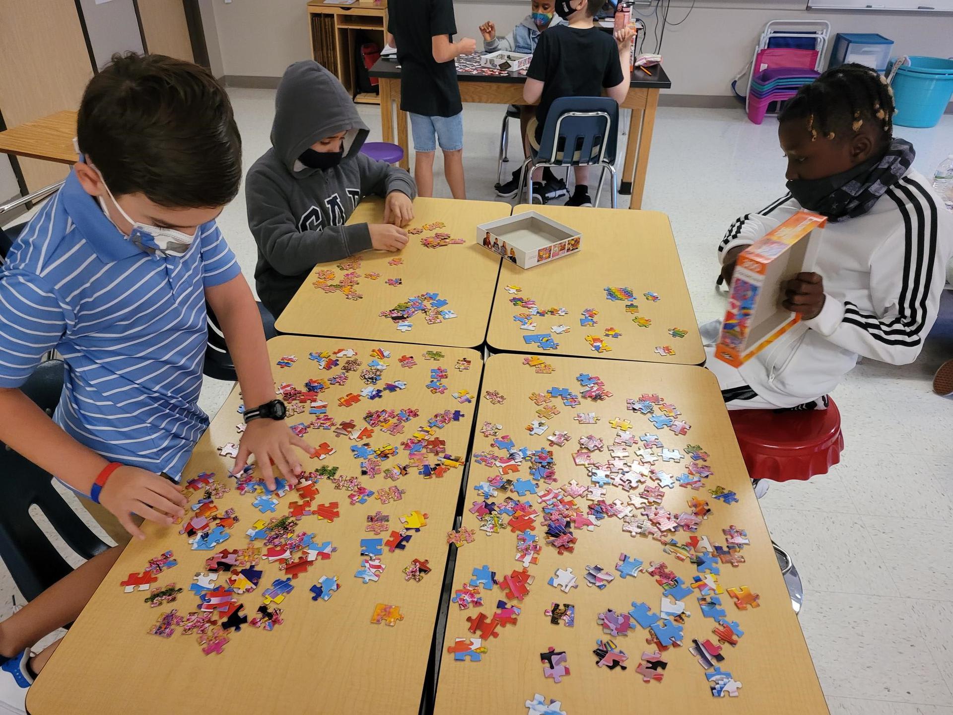 Mrs. Martino's 5th graders practicing Getting Along Together and Team-building by putting together jigsaw puzzles.
