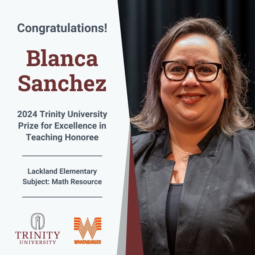 Trinity Prize Winner - Blanca Sanchez Congratulations on receiving this award and thank you for all the dedication to your students and community that you demonstrate on a daily basis. You truly are the best of our educators and it was our pleasure to honor you last Friday. Have a great finish to the school year and we hope you can enjoy some time off this summer. |