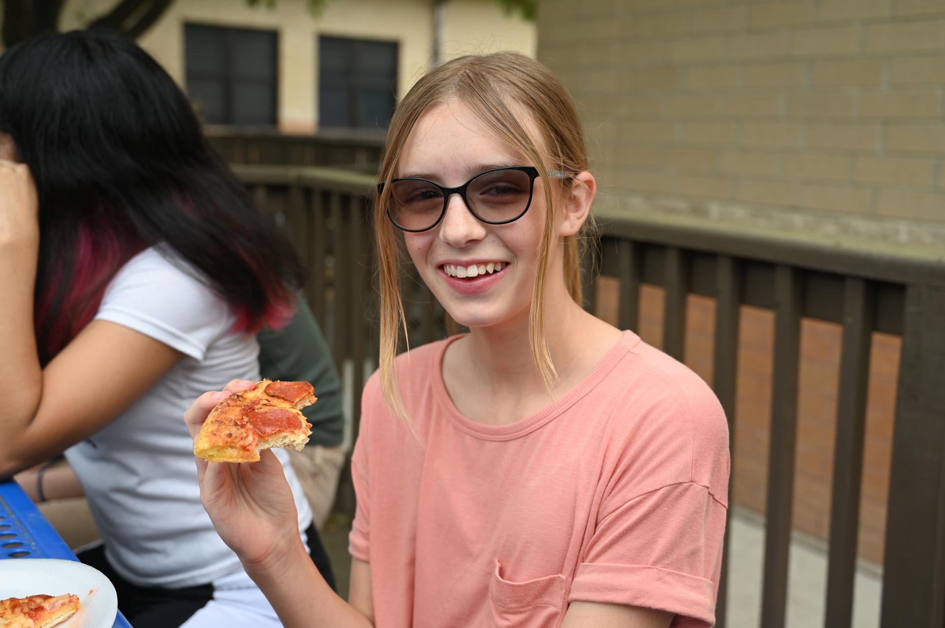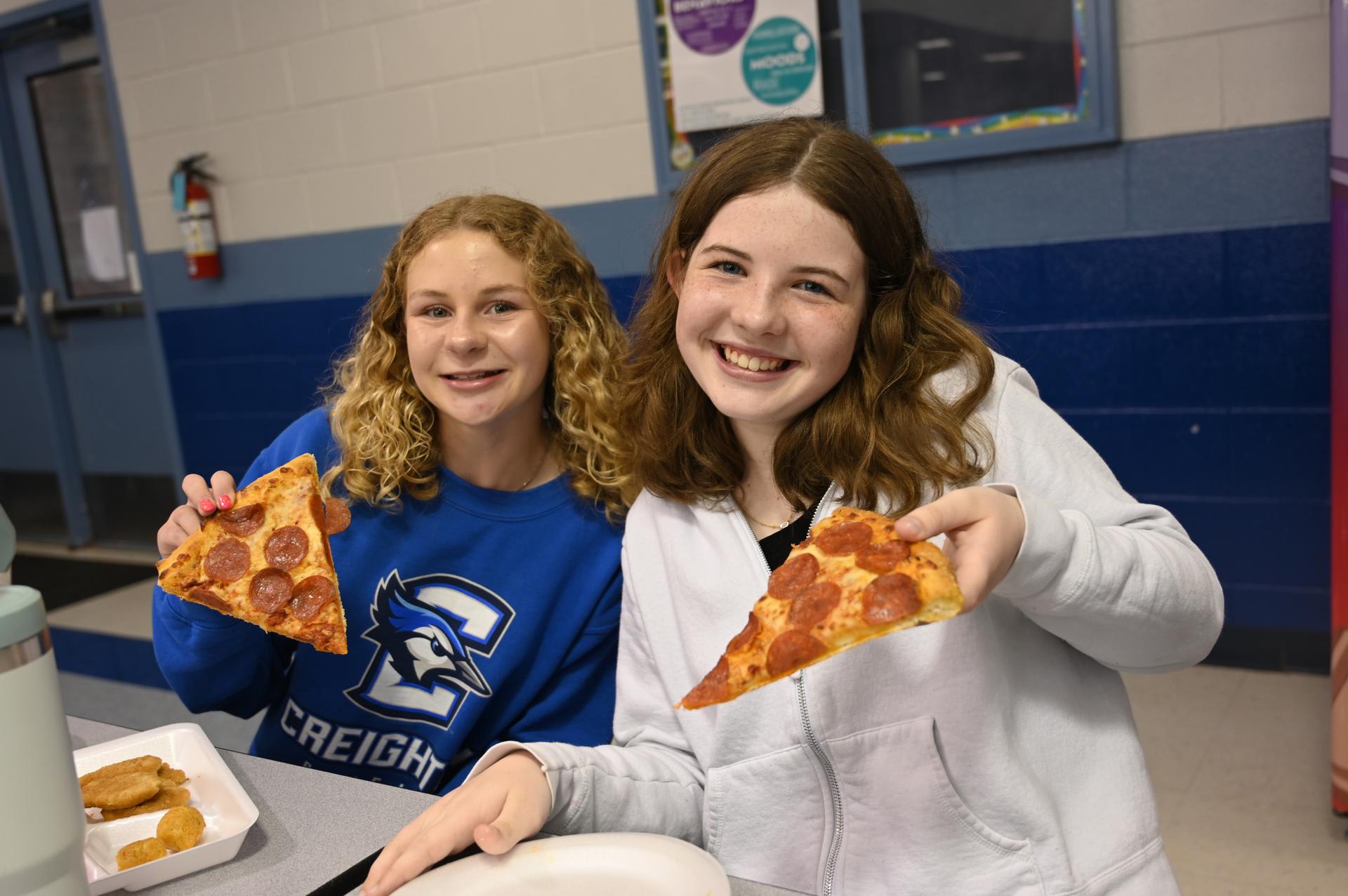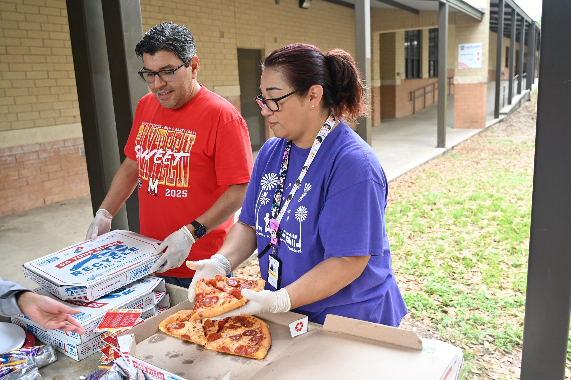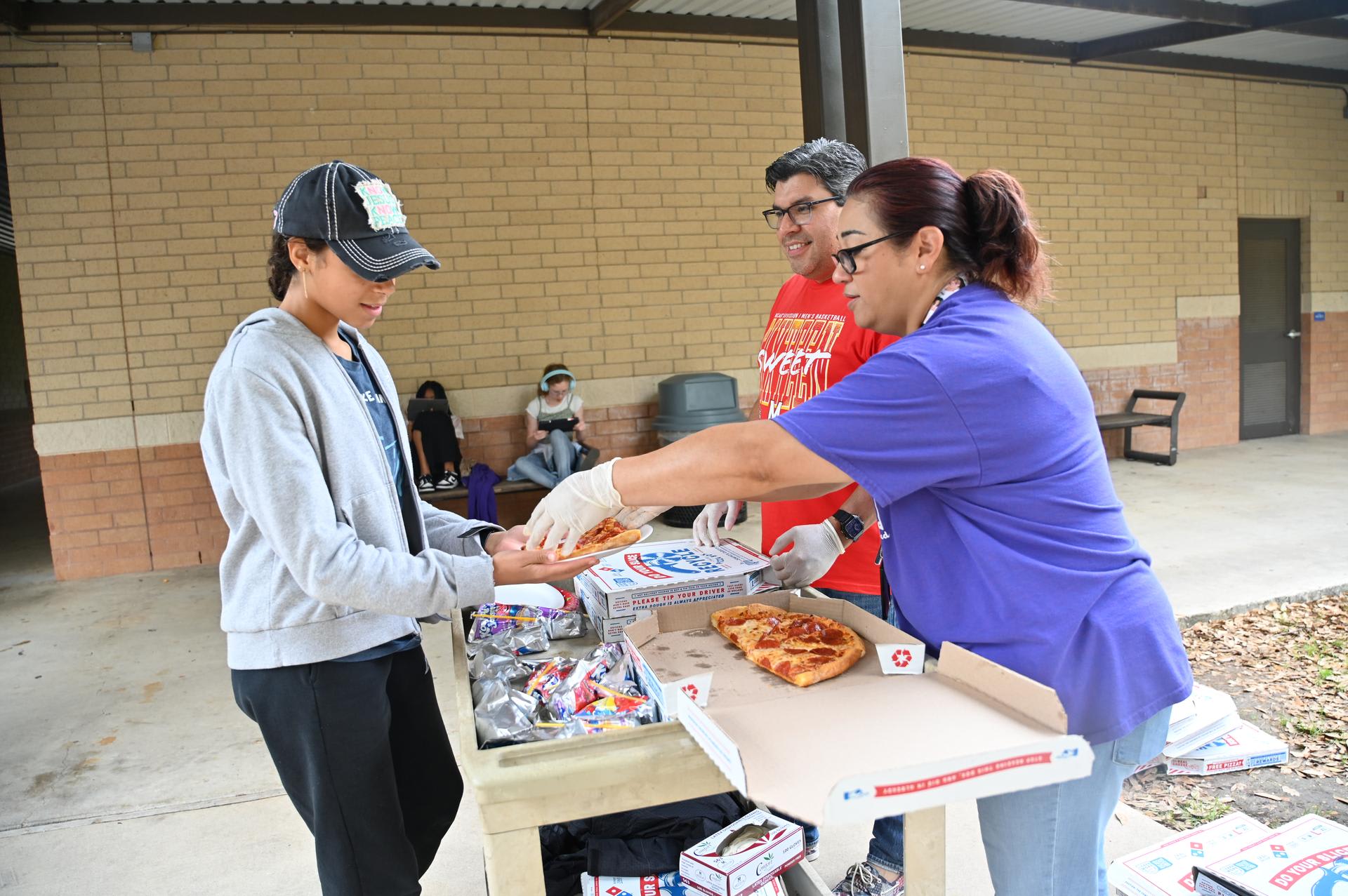Jr. High Incentive Jr. High students with good grades and good attendance were awarded coupons good for free pizza on Monday! It was served up by Ms. Rorick & Dr. Medellin outside of the Stacey cafeteria. |