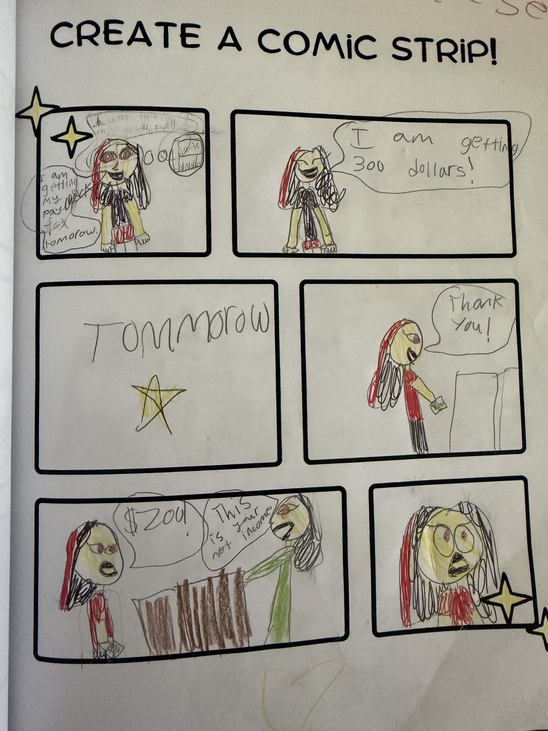 5th grade students in Mrs. Flores's math class had fun creating comics expressing the difference between gross income and net income. She loved how creative they were. |