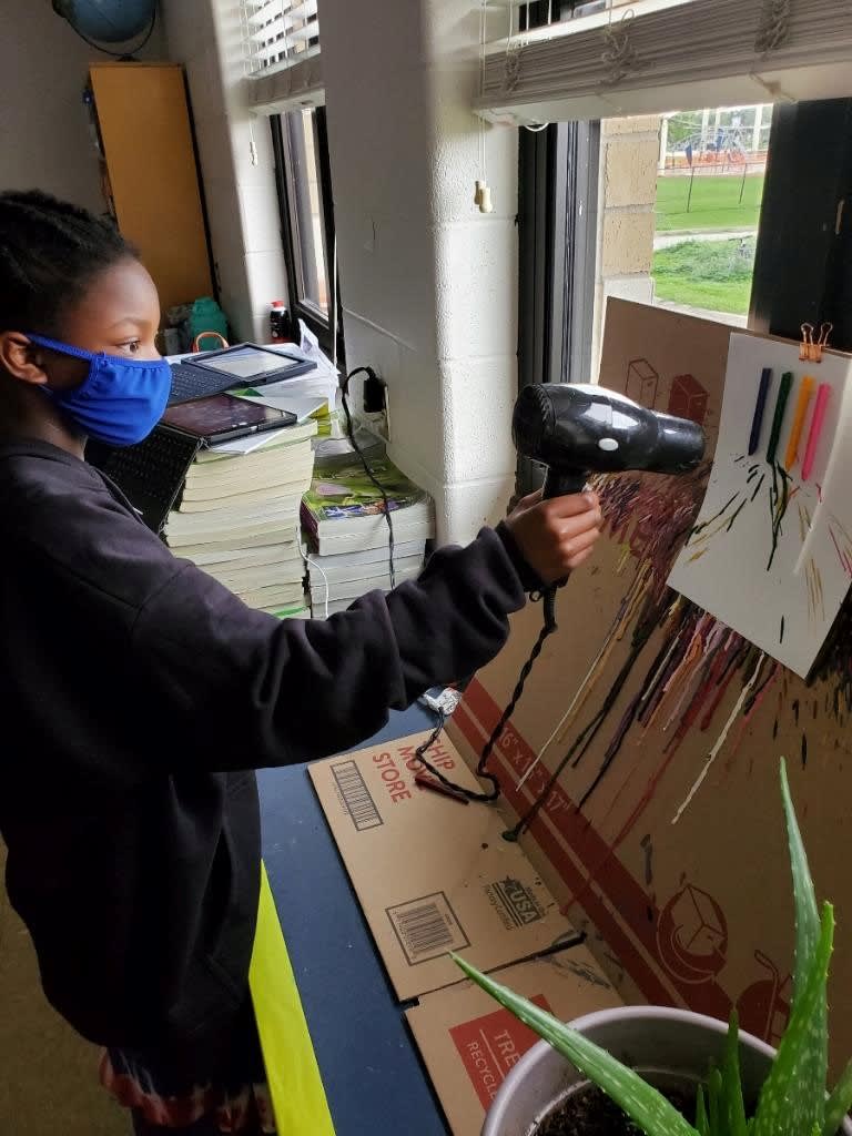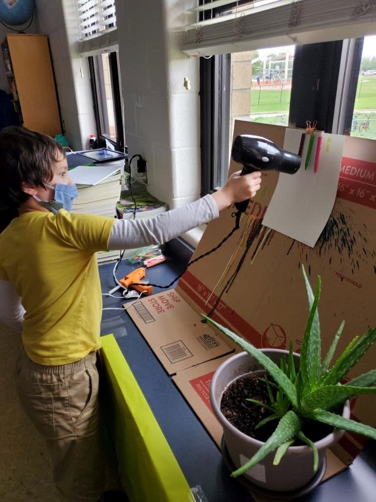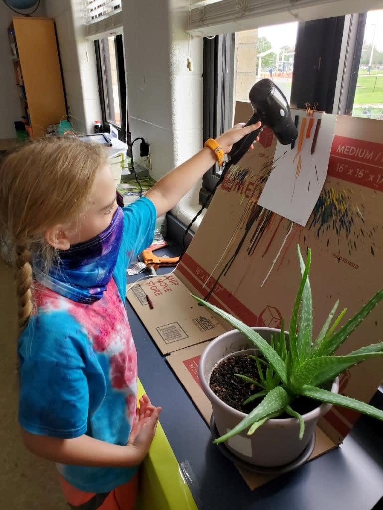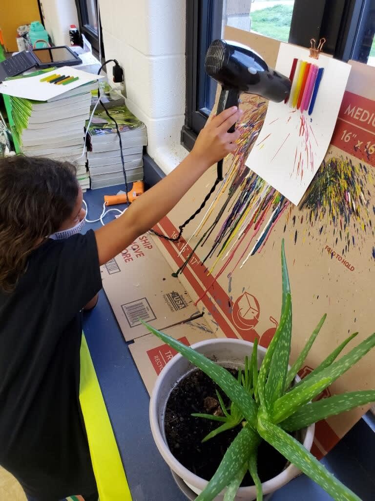 Third graders in Mrs. Gaskin's class learned about how heating and cooling worked by making a liquid rainbow. The solid crayons became a liquid and dripped down the paper. As the liquid crayons cooled, they became a solid again. This activity was an example of reversible change, since the melting was reversed once the crayons had a chance to cool.