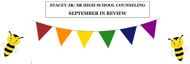 COUNSELORS IN ACTION: Wow! September has come and gone. Mrs. Castillo and Stacey Junior-Senior High School’s Military and Family Life Counselors supported the counseling department by providing guidance lessons on identifying everyday feelings, overwhelming feelings, coping strategies and suicide awareness. September was Suicide Awareness Month and these guidance lessons helped students identify local and national resources available in case they see someone in a mental health crisis. The stressors of the pandemic have increased mental health concerns in children and adolescents; counselors’ lessons helped students identify their own coping strategies to help them manage their feelings in times of distress. To bring about more awareness, counselors during both lunches provided students with suicide awareness pins and stickers.