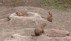The most common of the five North American species are the black-tailed prairie dogs that inhabit the Plains Region of the United States. They live in LARGE communities in extensive networks of burrows and chambers known as "dog towns" that are marked by mounds of packed earth at their entrances.