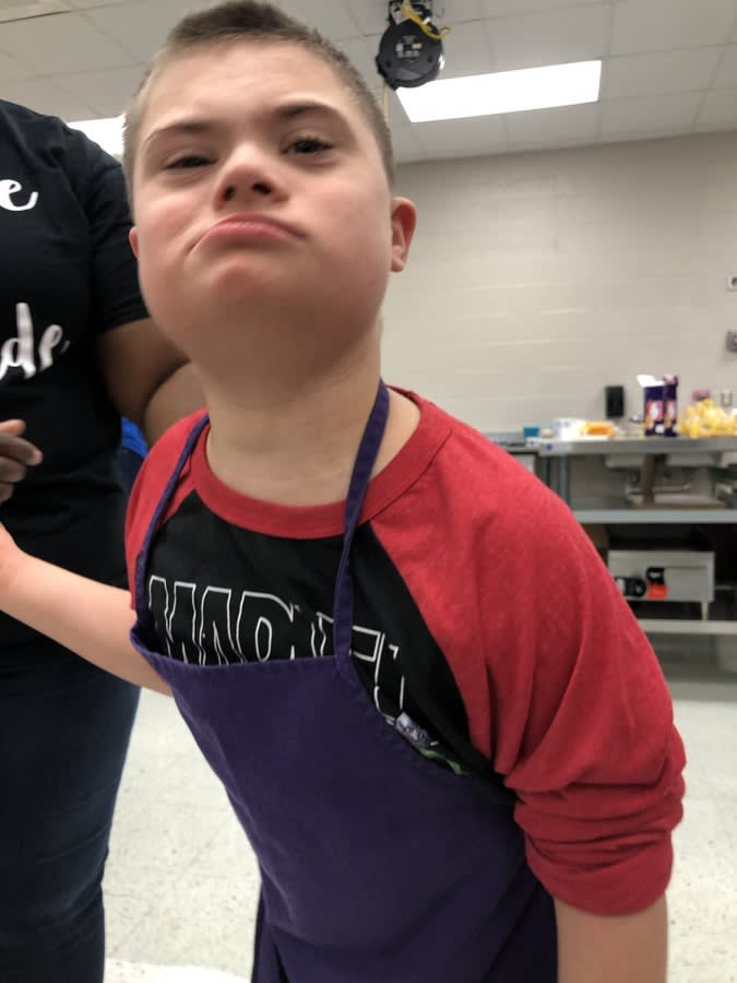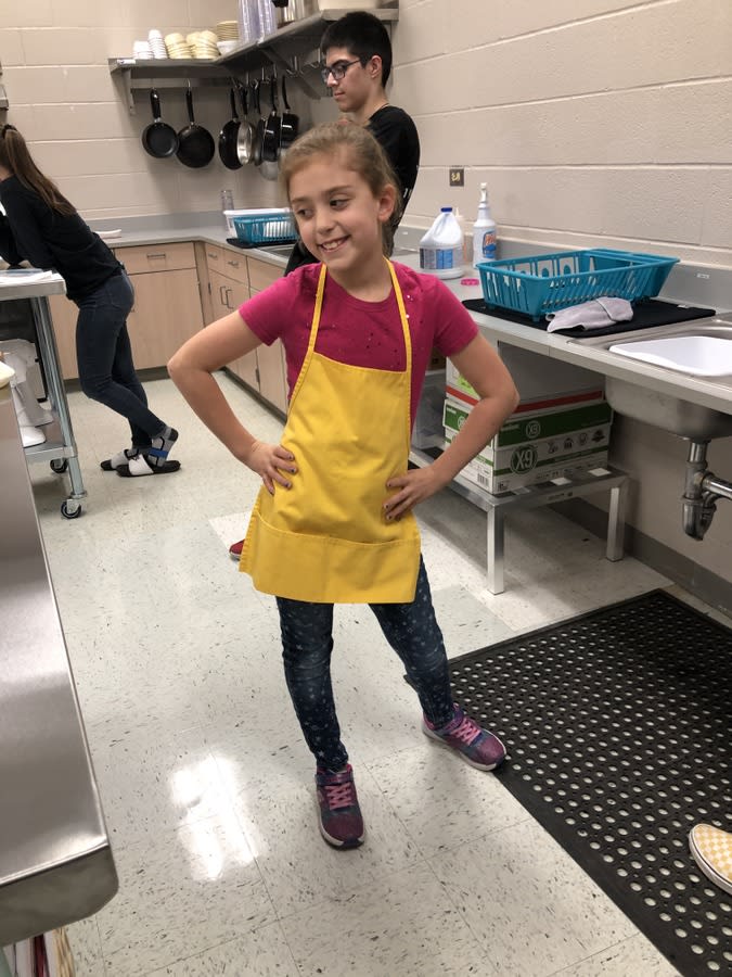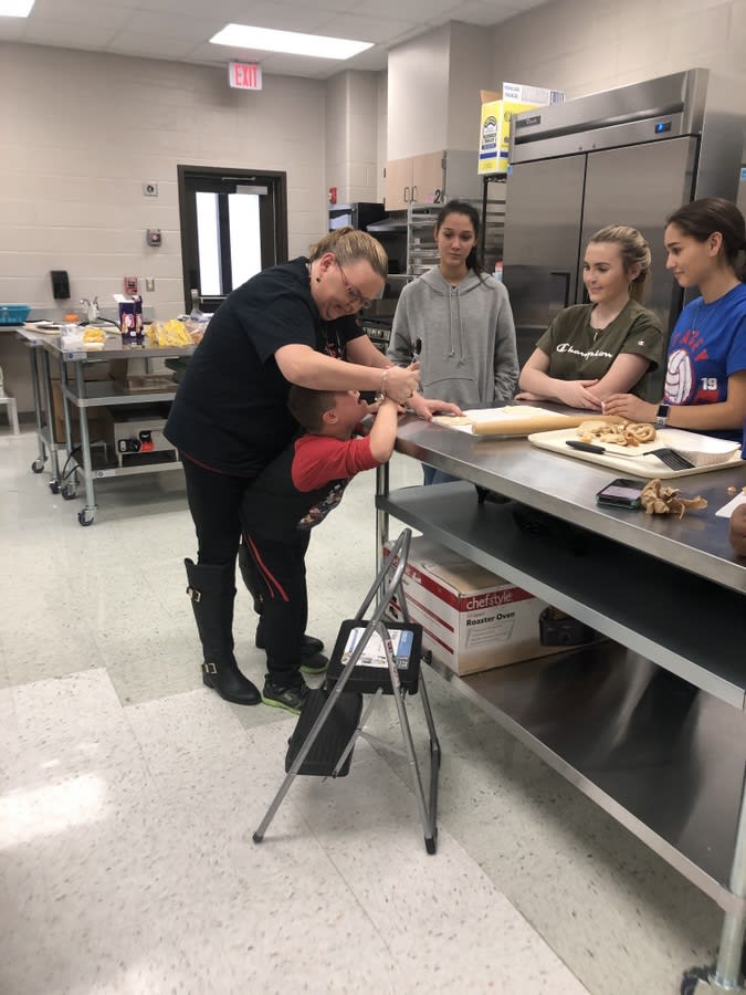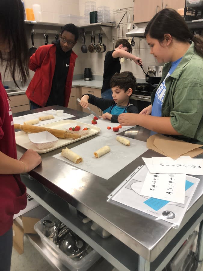 Ms. Thompson’s class went to the high school to cook with the culinary class. We made grilled cheese roll-ups and juice.