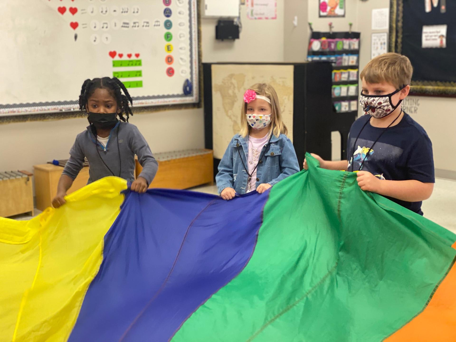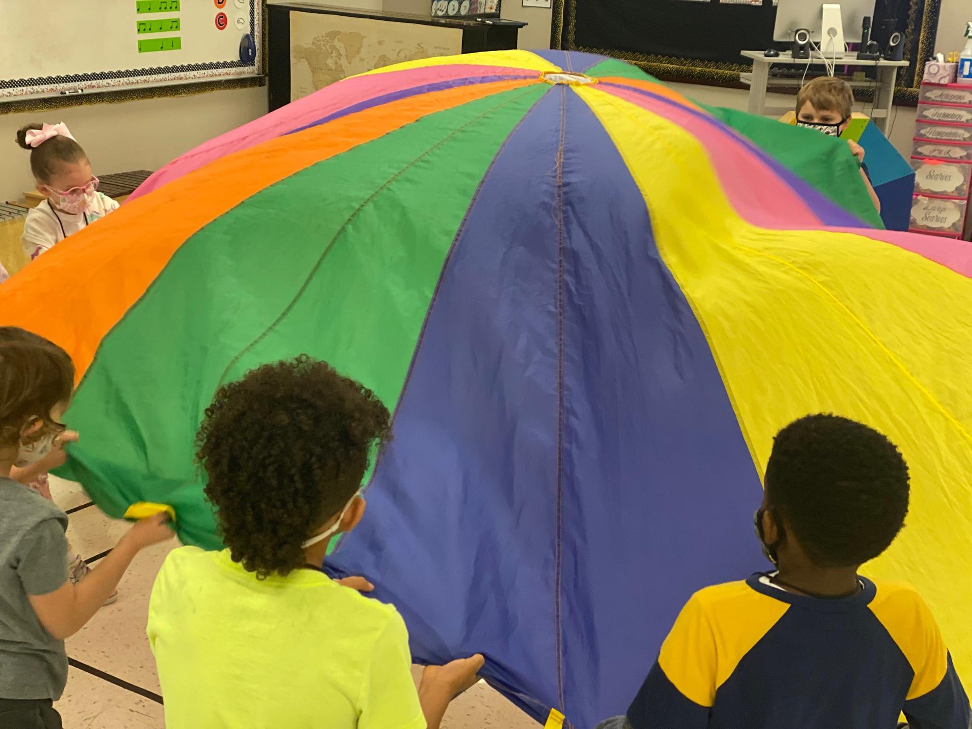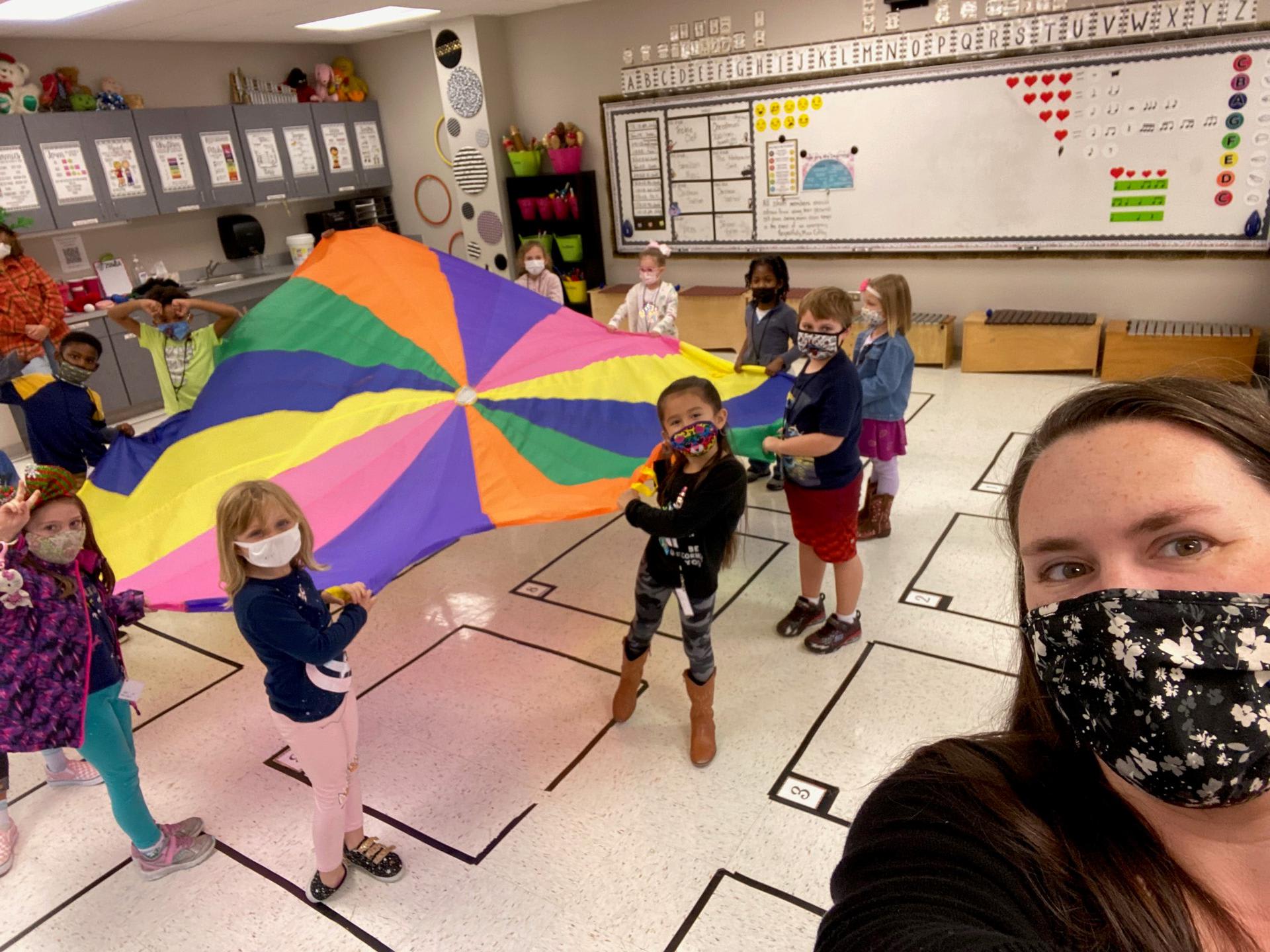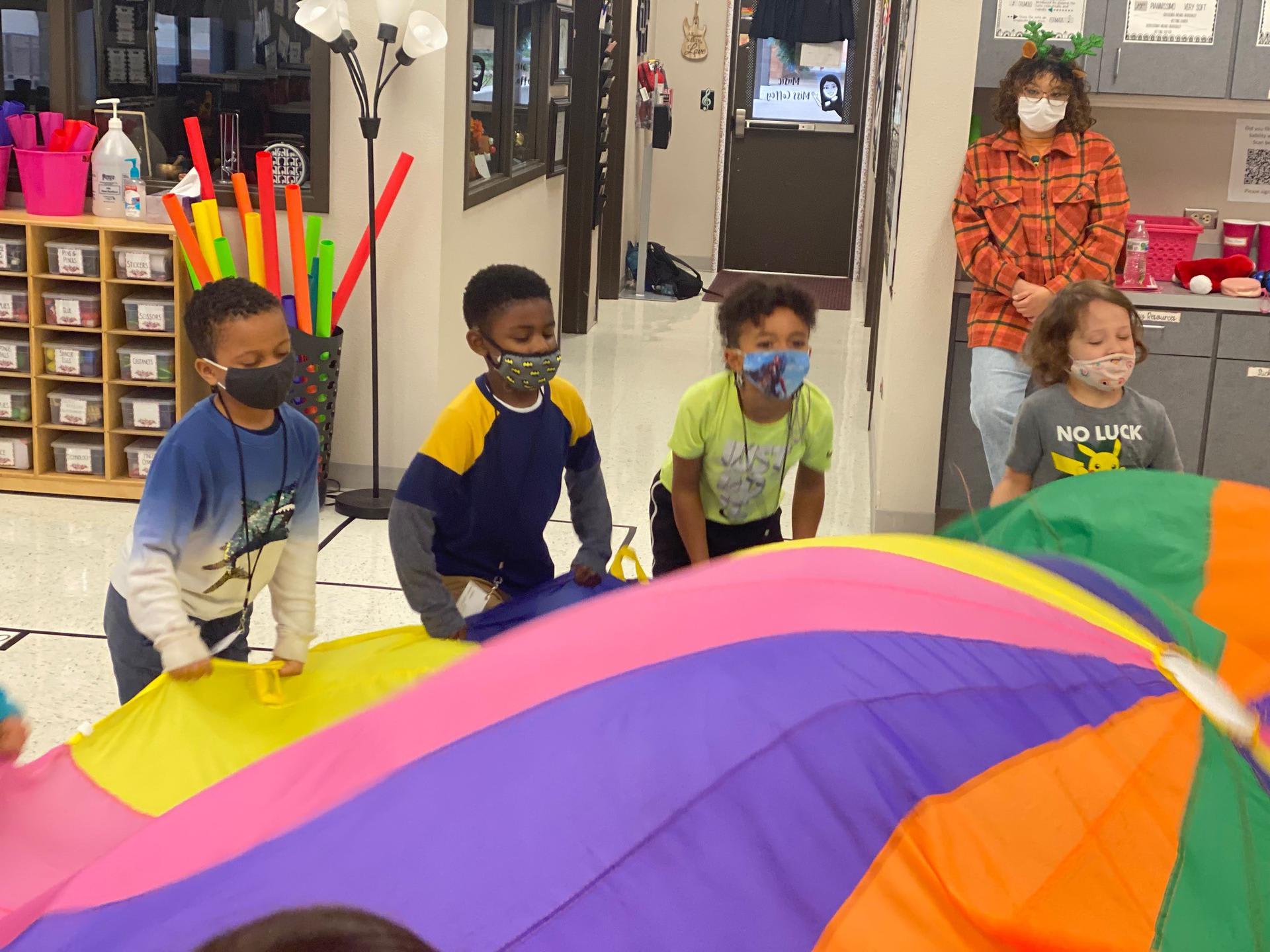 Ms. Herrera’s 1st grade class enjoying parachute Christmas carols in music. |