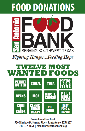 Lackland ISD Student Councils are partnering to sponsor a food drive to benefit the San Antonio Food Bank. Donation bins are located in the Stacey front office lobby and the Stacey cafeteria. Additional bins are located in the administration building and at the elementary campus. Help us make a difference for families in need this holiday season. |