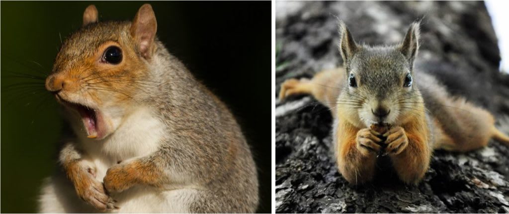 Squirrels are generally small animals, ranging in size from the African pygmy squirrel at 3.9-5.5 inches in total length and and just 0.42-0.92 ounces in weight. Squirrels typically have slender bodies with very long bushy tails and large eyes. In general, their fur is soft and silky, though much thicker in some species than others. The coat of a squirrels is highly differentiated between and within the species.