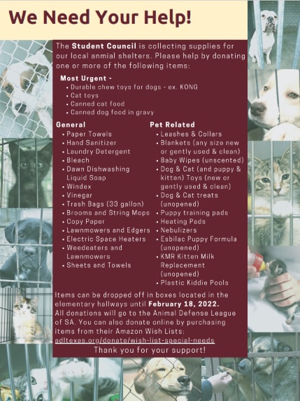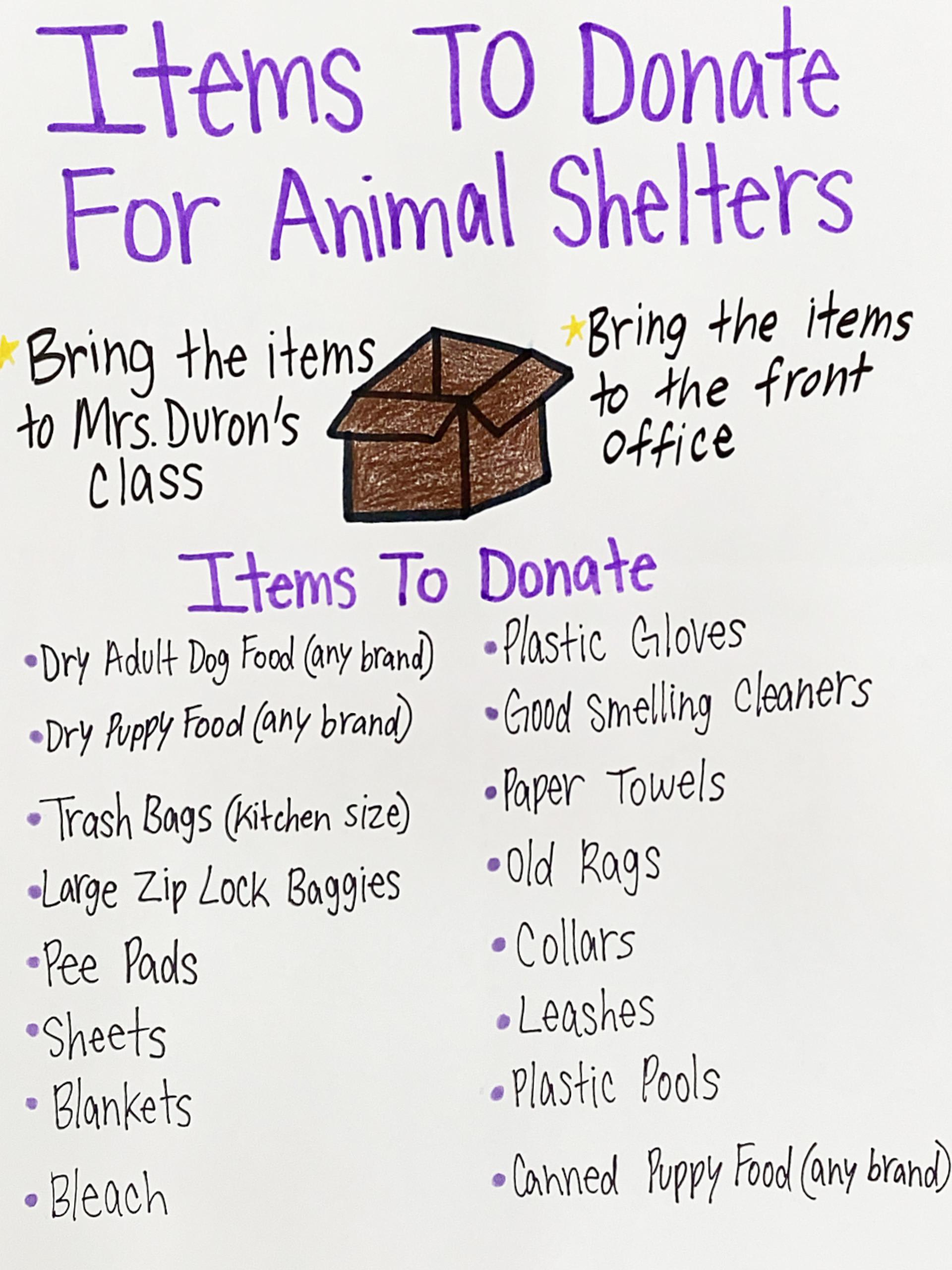 Do you love animals? Well if you do, there are some dogs and cats that need your help. The Family and Community service class is collecting items for Charming Pet Rescue. Some items you can donate are dog and cat food of any brand, bleach, kitchen size trash bags, paper towels, and large zip lock bags. There are posters hanging around school that have other items you can donate if you’re interested. All items can be turned in to Mrs. Duron's room or the high school front office. The last day items will be accepted is Friday, March 4th.