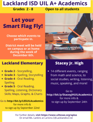 Linked below are copies of the State of Texas 2020–21 School Report Card for Lackland Elementary School and Stacey Jr/Sr High School. These reports are required by the Texas Legislature and prepared by the Texas Education Agency. The School Report Card is to be sent to the parent or guardian of every child enrolled in a Texas public school. The report provides information concerning student performance on the State of Texas Assessments of Academic Readiness (STAAR® ) and information on student enrollment, class size averages, and financial expenditures.