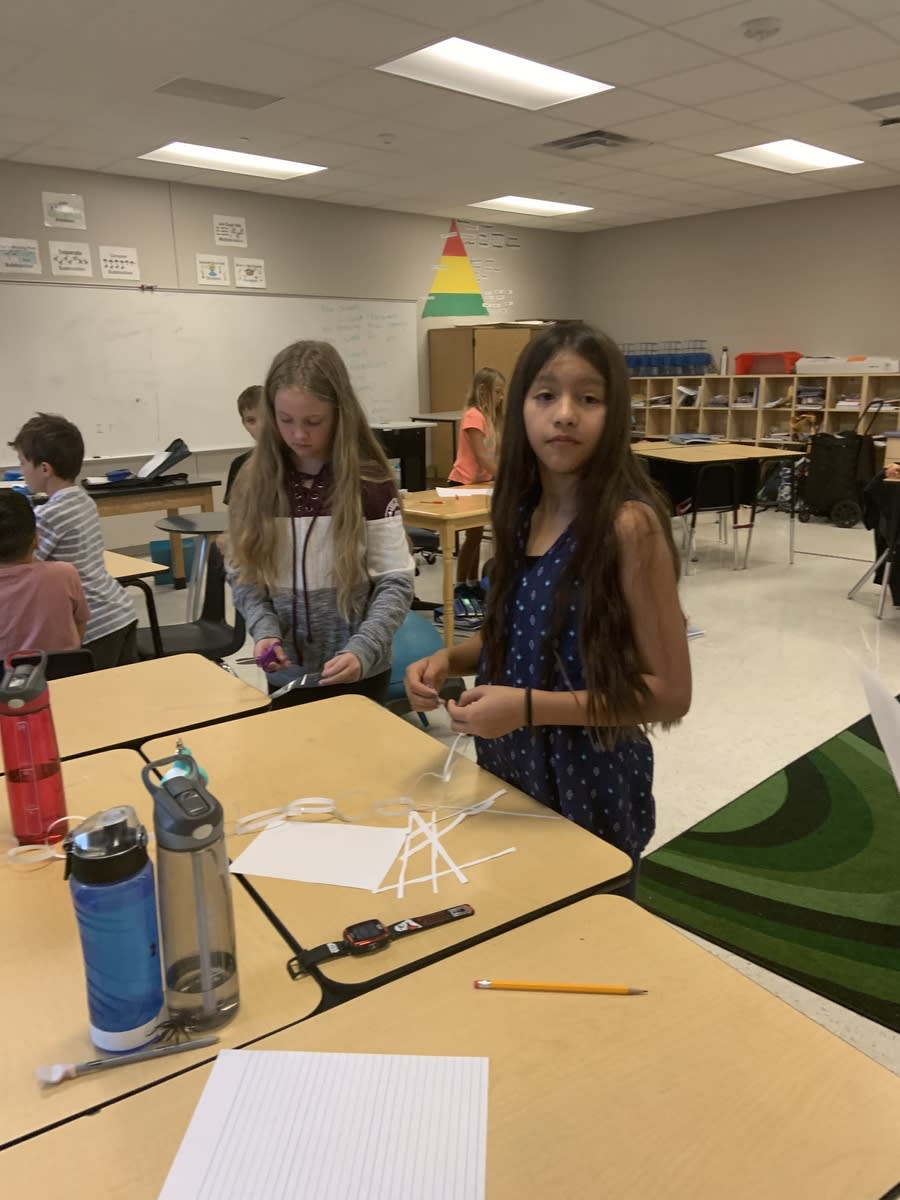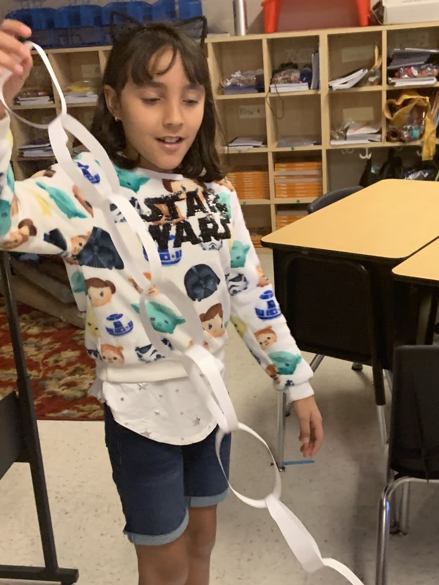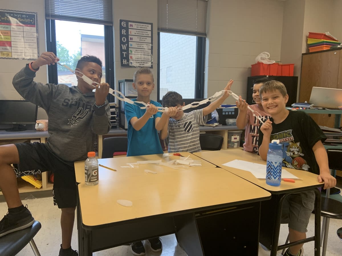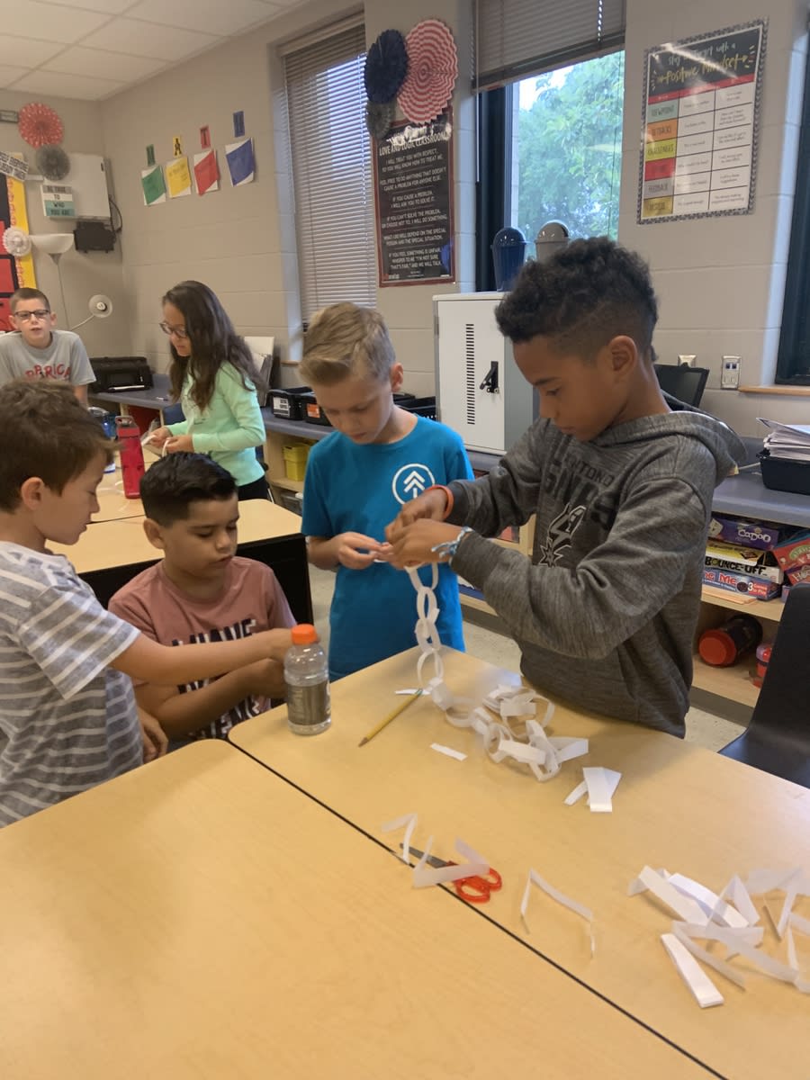 Fifth graders in Mrs. Ryan's class worked collaboratively to create the longest paper chain they could with two pieces of paper. They’ve been measured to the nearest 10th of an inch and added the measurements to see how long our class chains were. Communication and creativity was key in this activity.
