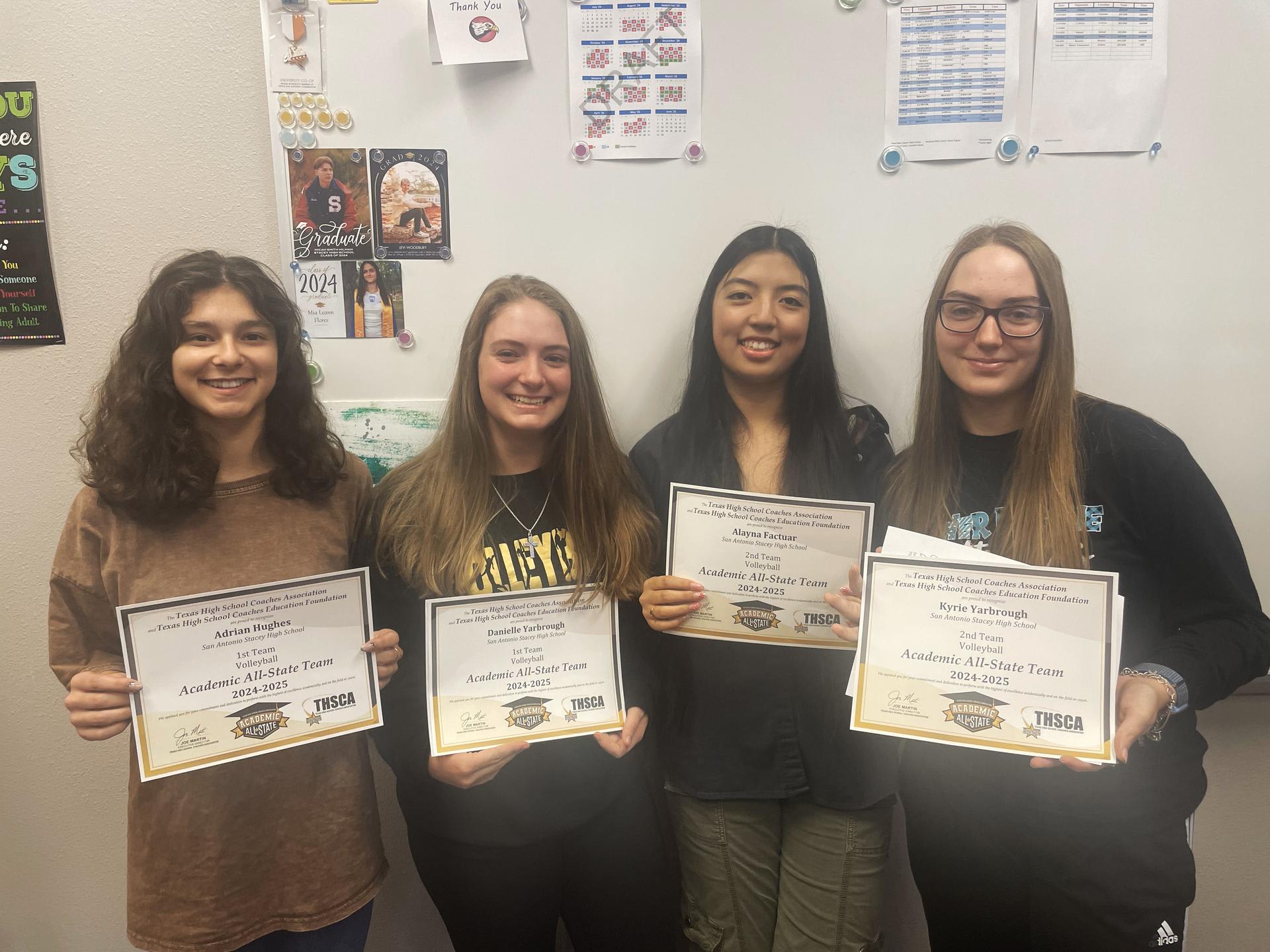 Congratulations to these young ladies for being selected to the Texas High School Coaches Association All Academic State Team!!! From left to right, Adrian Hughes and Danielle Yarbough were selected to the 1st Team and Alayna Factuar and Kyrie Yarbrough were selected to the 2nd Team!! This is a testament to their hard work both on and off the court!!!