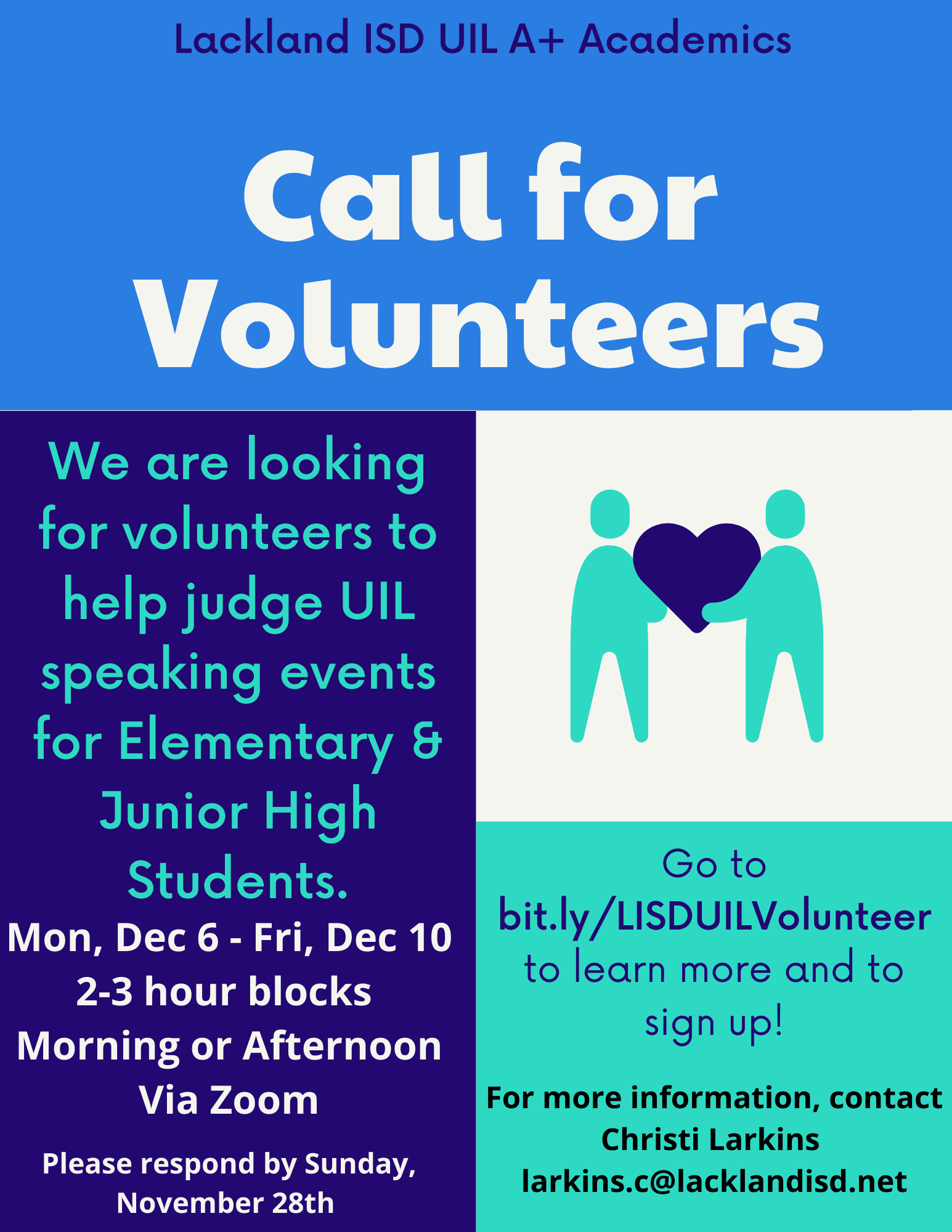LISD is hosting the 30-2A UIL A+ Academics District Meet and are in need of some volunteers to help judge our Speaking Events (via Zoom) from December 6th – 10th.