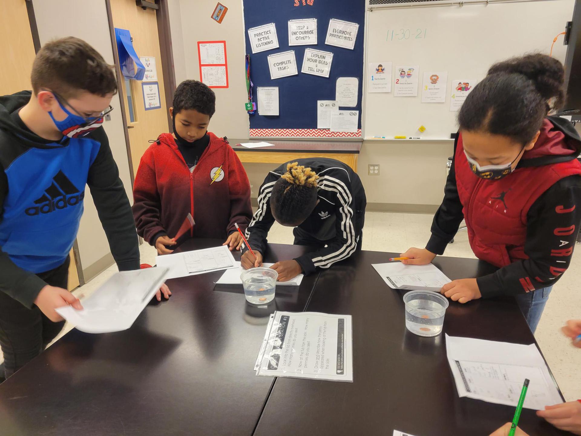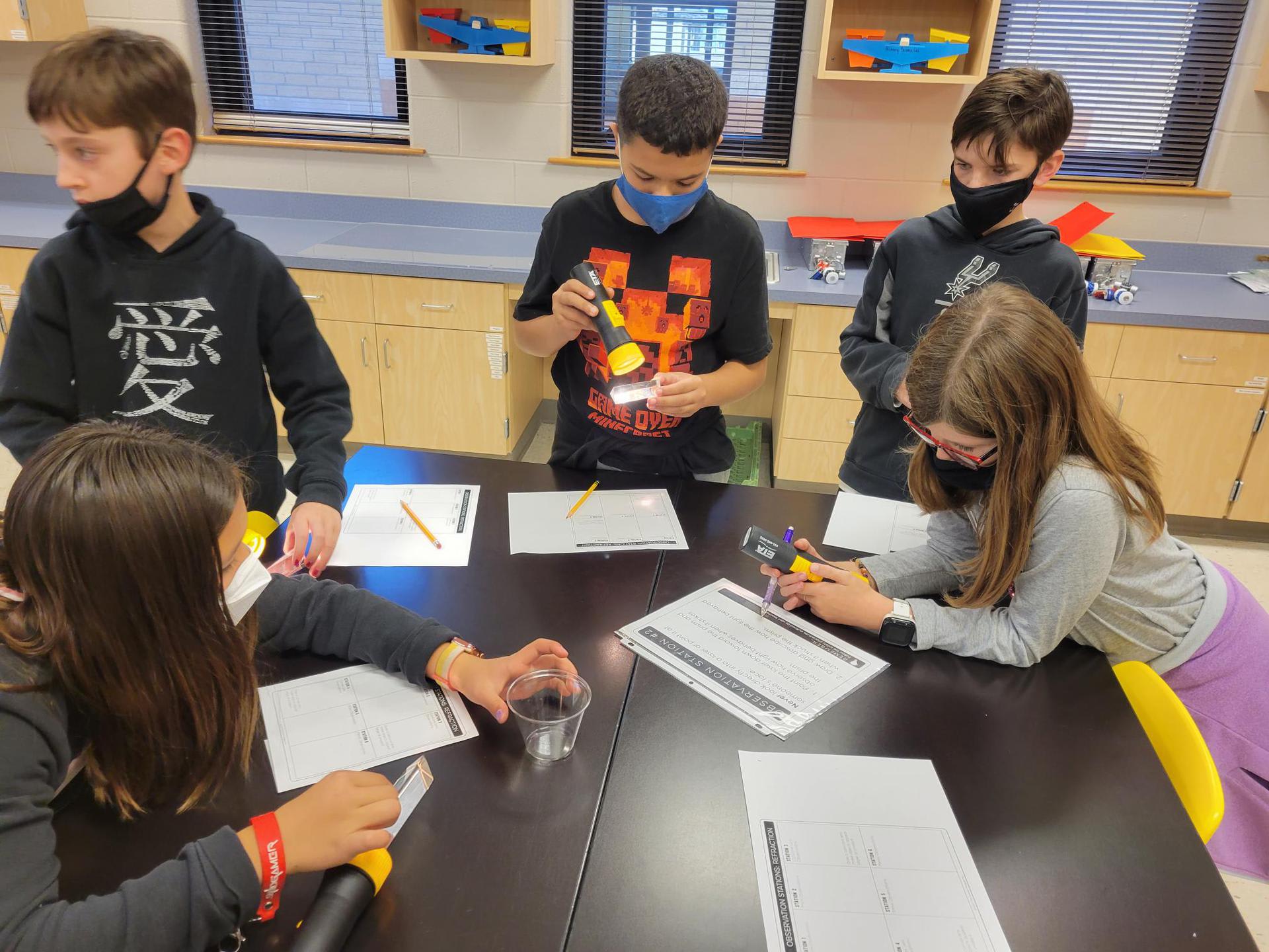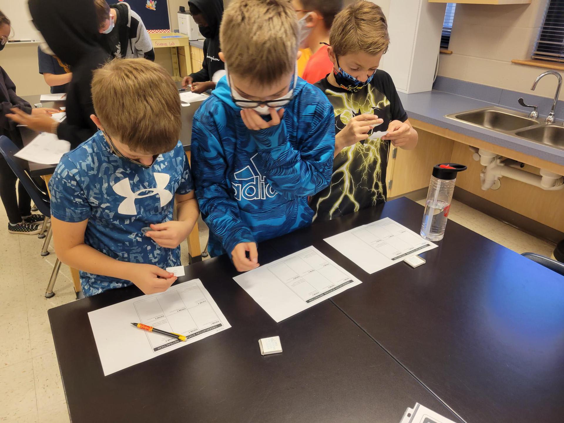 5th graders in Mrs. Crawford’s and Mrs. Martino’s class experiencing refraction through observation stations. They observed many ways light can be refracted. |