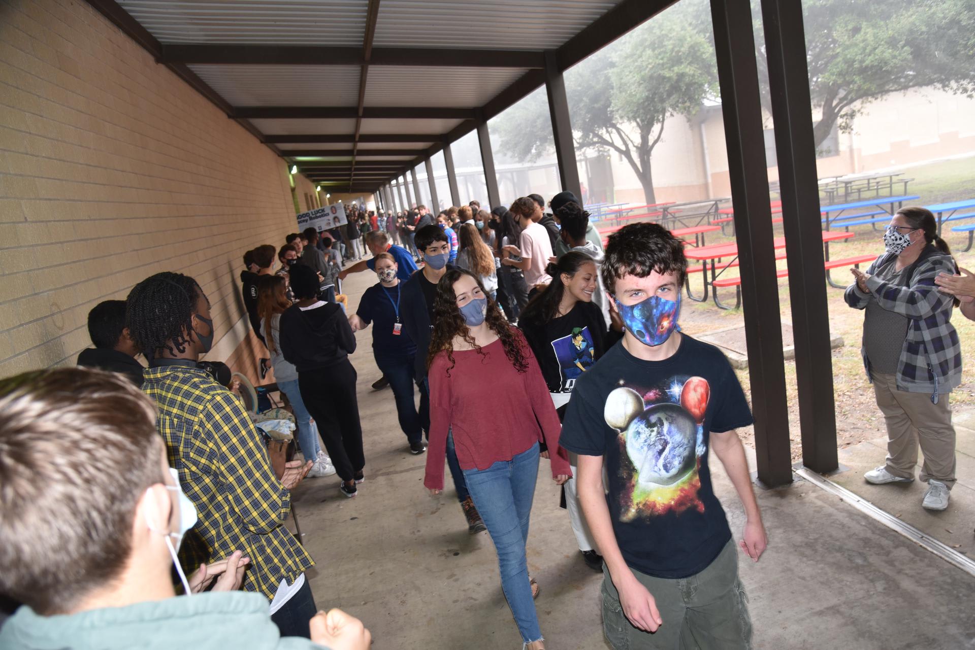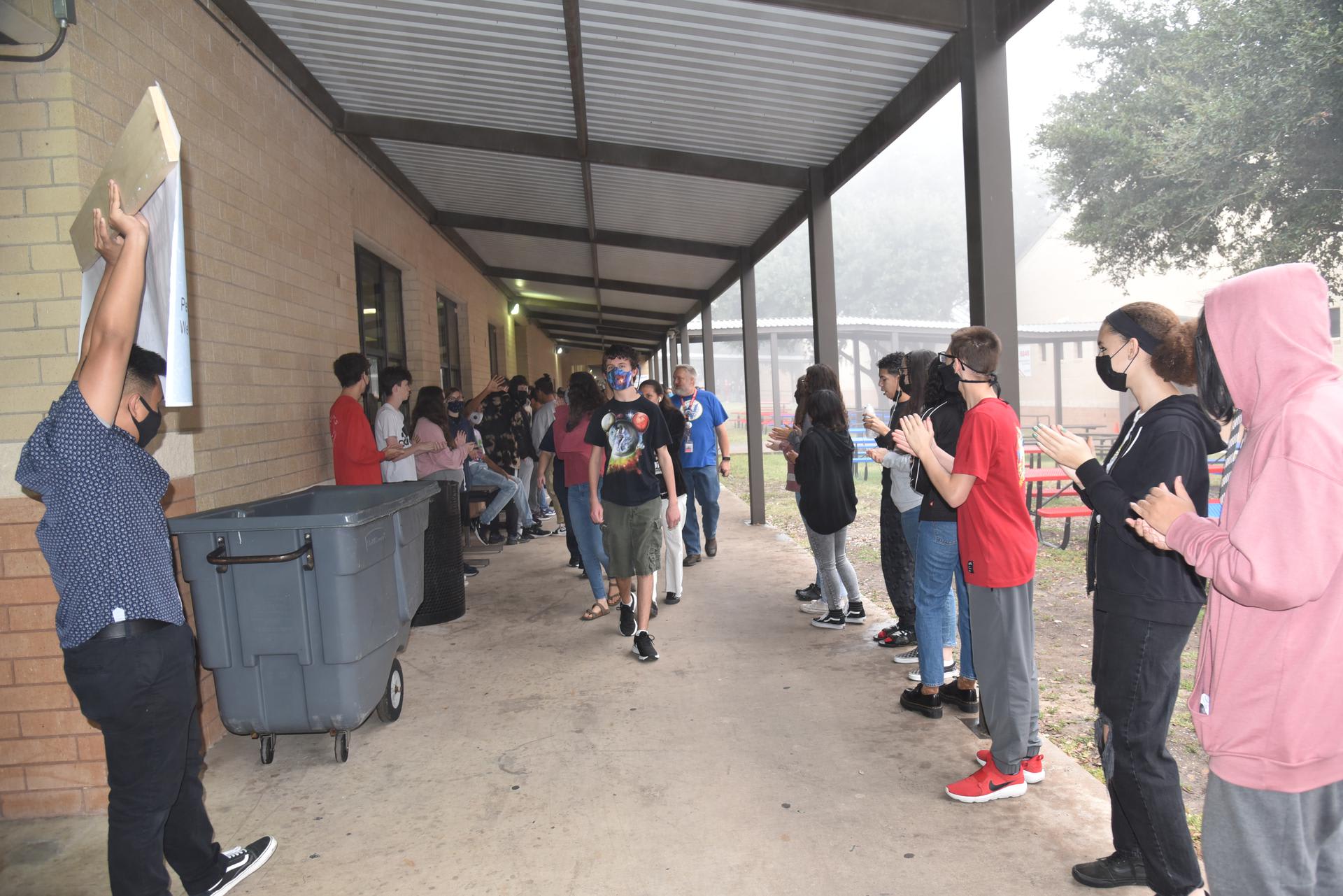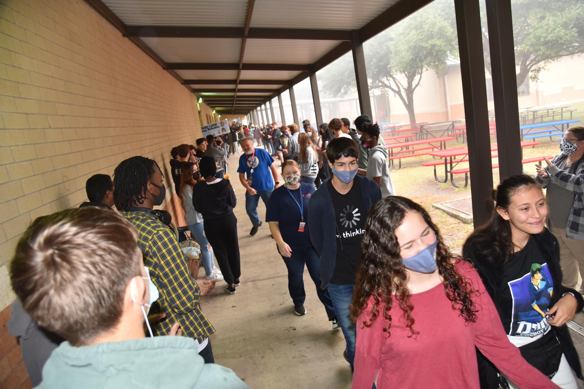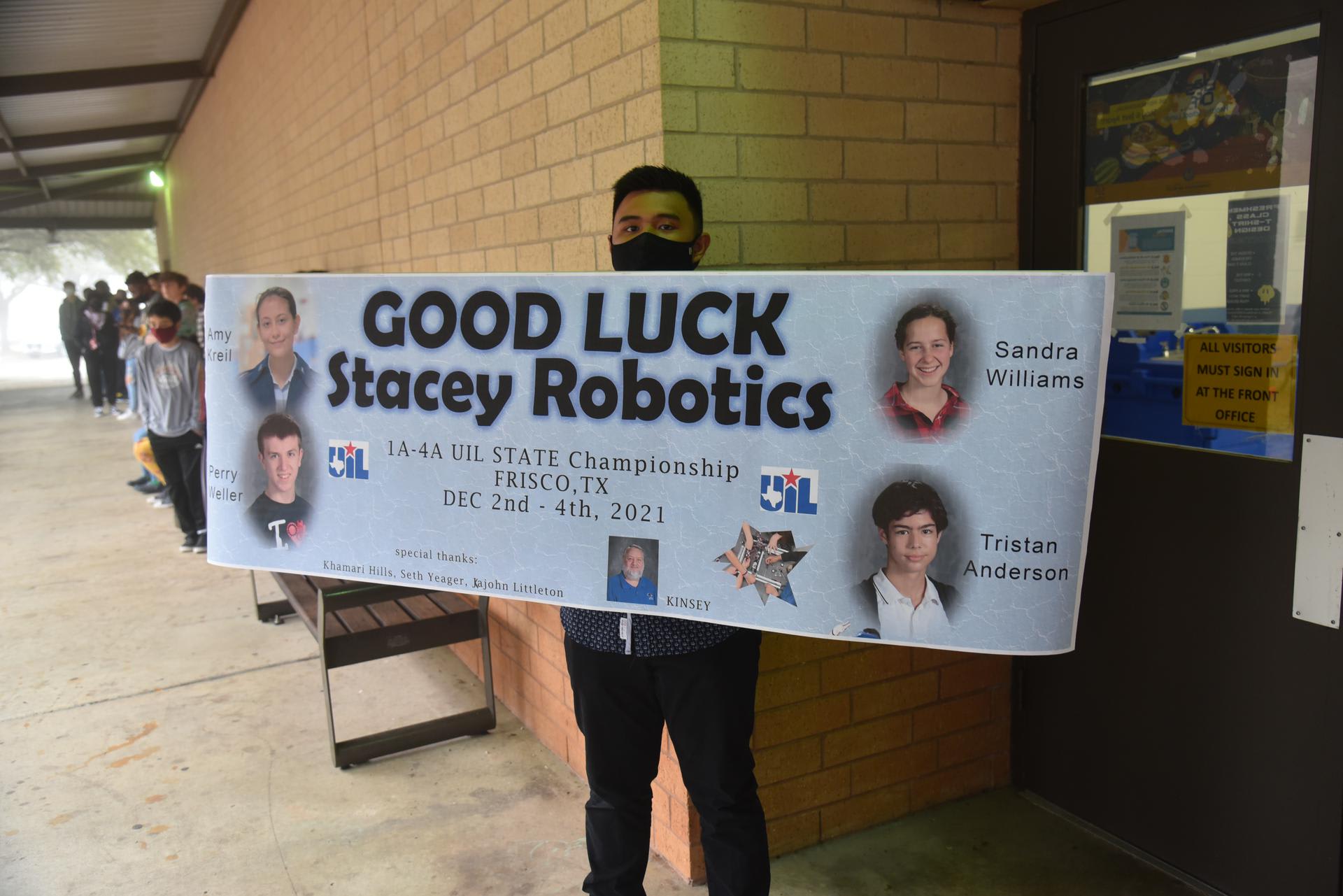 Good luck to the Stacey Robotics team as they travel to Frisco, TX to compete in the 1A-4A UIL State Championships this weekend! Stacey students lined the walkway on Thursday morning to cheer and wish the team well as they left campus. Pictured ( Perry Weller-11th, Amy Kreil-11th, Mr. Kinsey, Sandra Williams-11th, Tristan Anderson-10th, & Mrs. Huerta) .