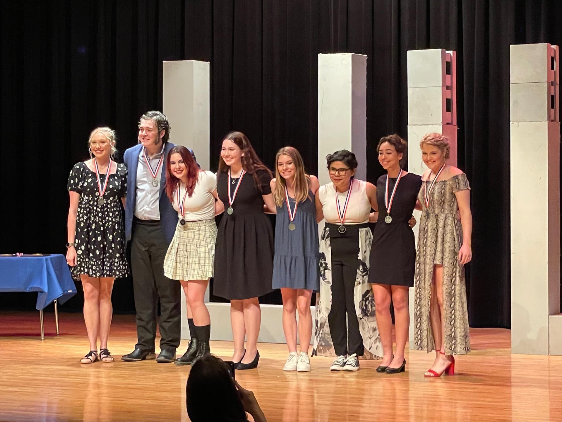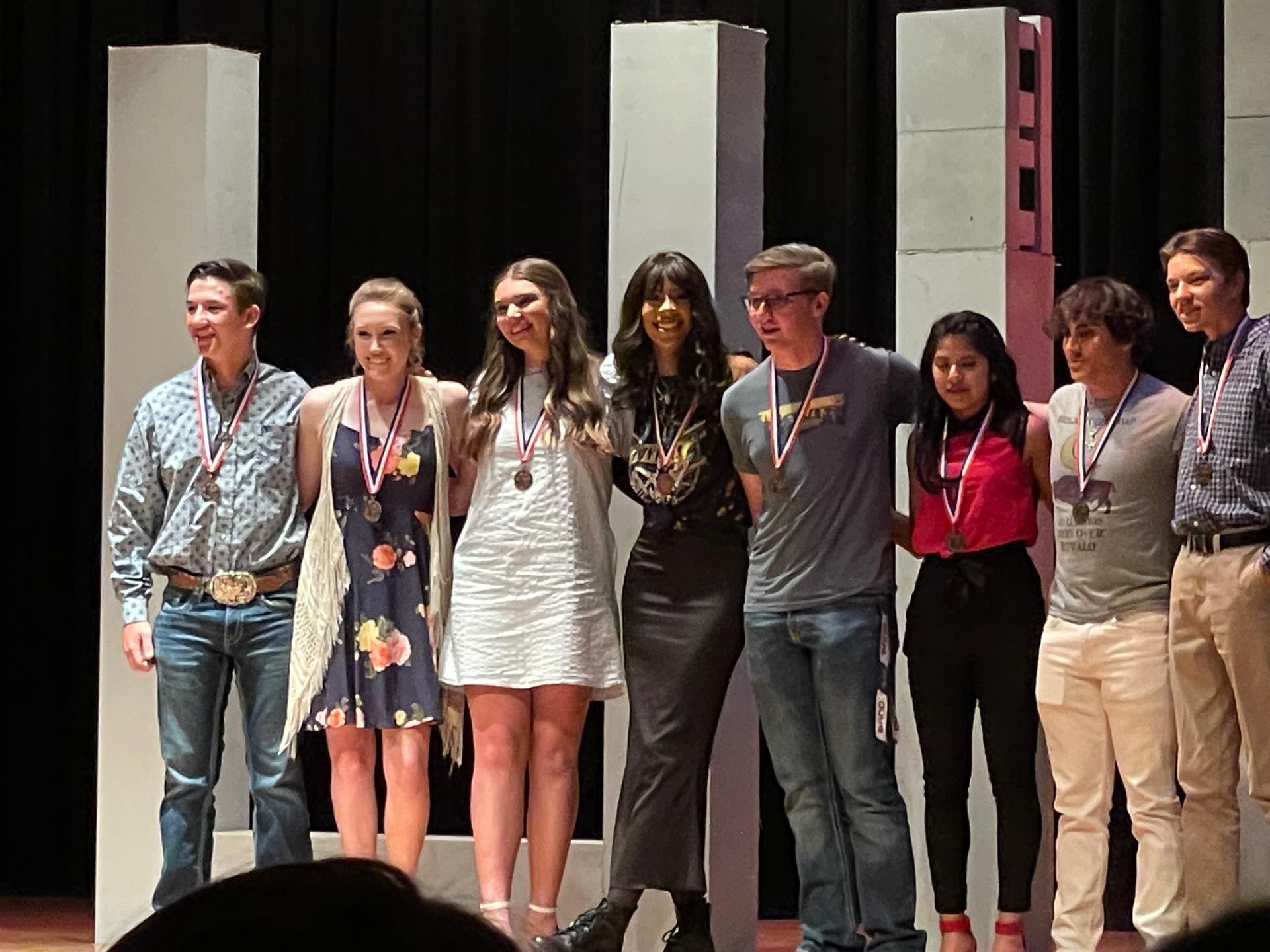 On March 11th the Stacey Drama Club competed in the UIL One Act Play competition with their production of "Desdemona in the Afterlife." Their play advanced to bi-district competition with Siarra Smith winning a technical award, Fanny Johannson and Alex Ho winning Honorable Mention All Star Cast awards and Maggie King, Grace O'Brien and Ivy winning All Star Cast honors. At bi-district competition in Kerrville on March 17th the play did not advance to area competition but Slater Reid won a technical award, Ivy won Honorable Mention All Star Cast and Maggie King was named to the All Star Cast. Additionally, the entire technical crew of Caila Crincic, Slater Reid and Siarra Smith were awarded Best Technical Crew, a special award from the host school Kerrville Tivy High School. Stay tuned for details about upcoming public performances of "Desdemona in the Afterlife" here at Stacey.