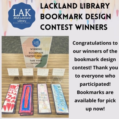 Three of our students were big winners in the JBSA Lackland Library bookmark design contest last month! Winning designs were printed and distributed at the base library. Stop by to pick one up to support our talented artists! |